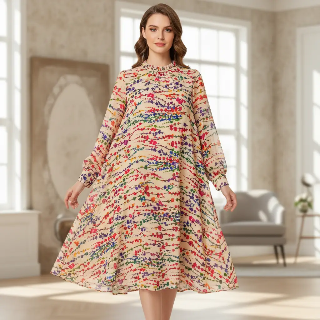 Tessuto Georgette a fantasia dalla mano fine, morbida e granulosa, leggermente trasparente, si presta alla realizzazione di camicie, abiti, gonne e bluse.
