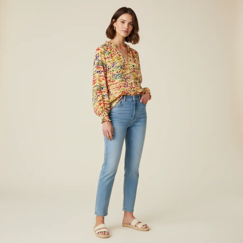 Tessuto Georgette a fantasia dalla mano fine, morbida e granulosa, leggermente trasparente, si presta alla realizzazione di camicie, abiti, gonne e bluse.