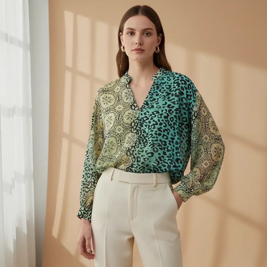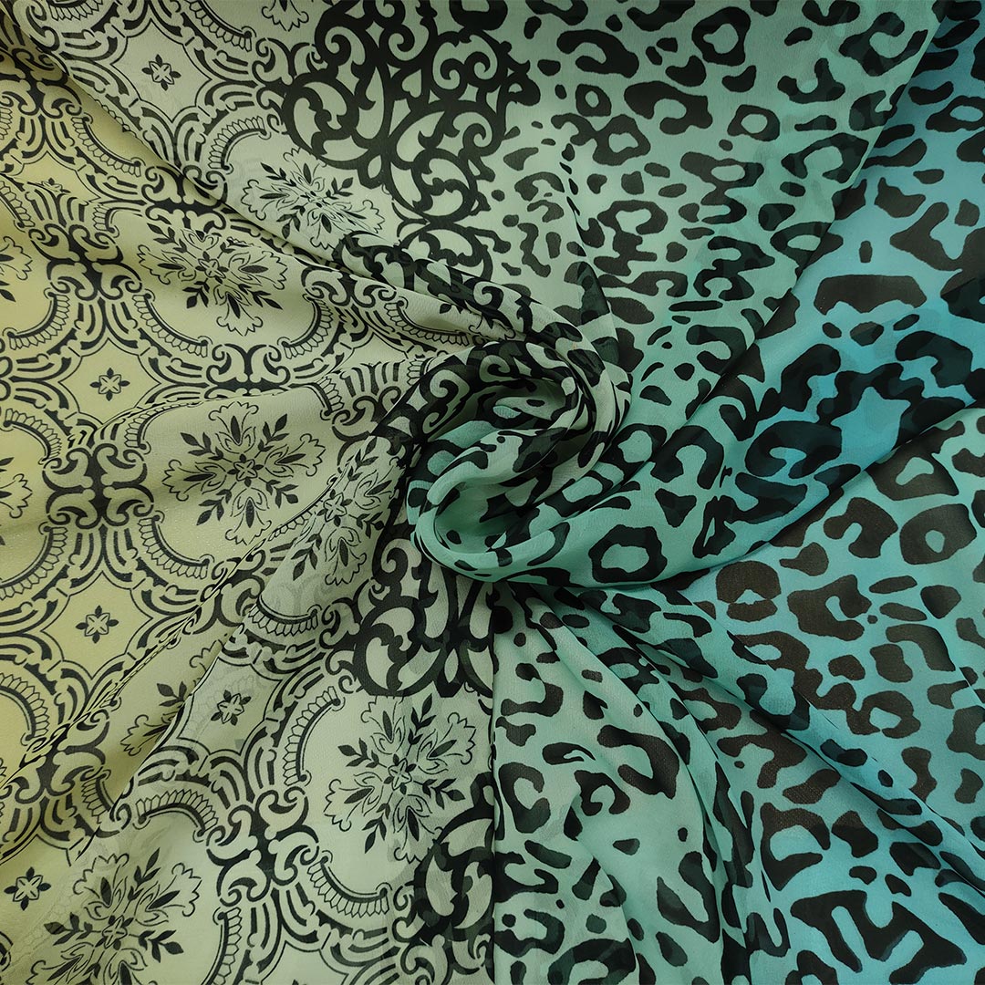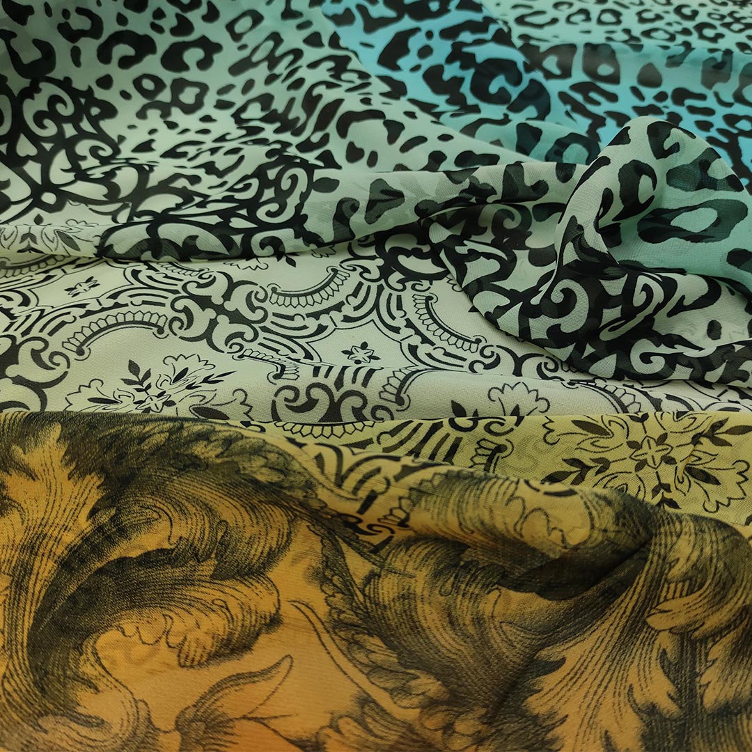 Tessuto Georgette a fantasia dalla mano fine, morbida e granulosa, leggermente trasparente, si presta alla realizzazione di camicie, abiti, gonne e bluse.