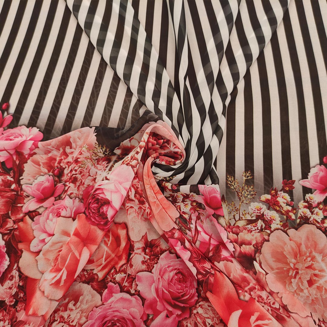 Tessuto Georgette a fantasia motivo astratto nero – bianco – corallo – rosa