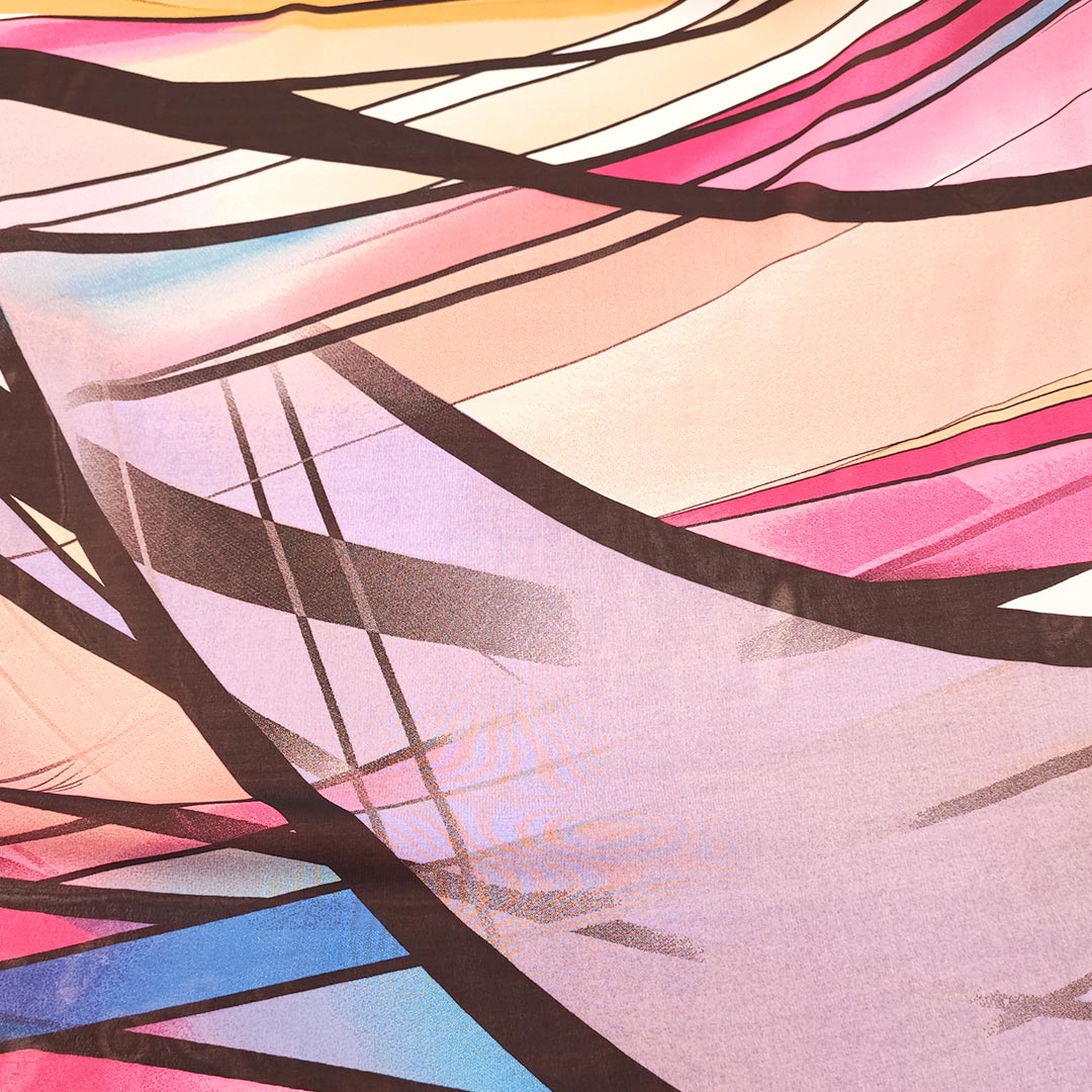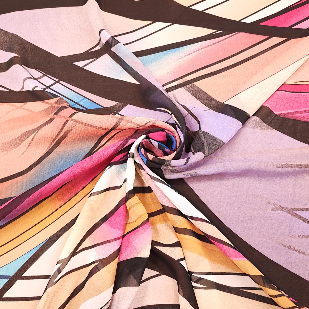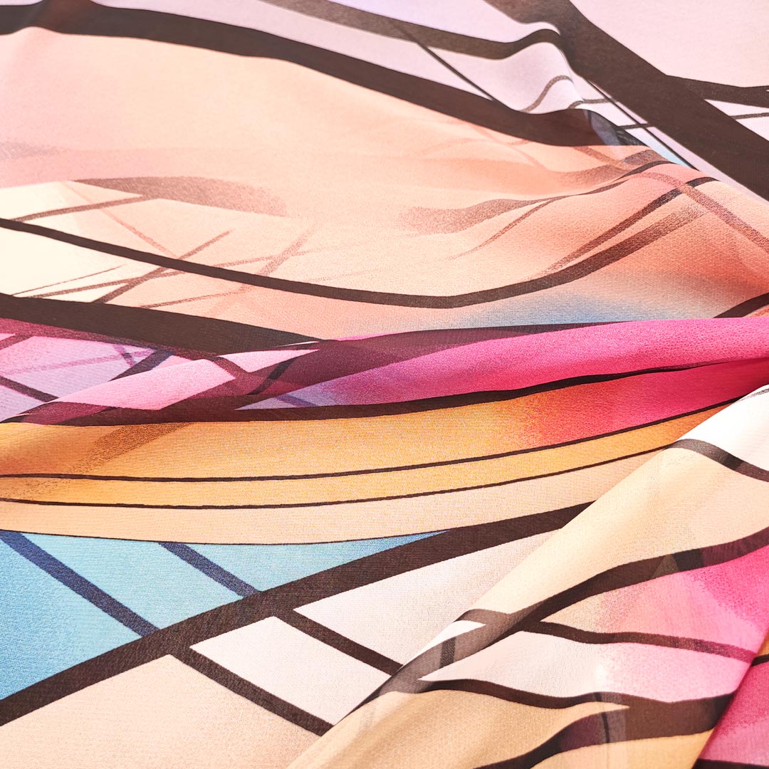 Tessuto Georgette a fantasia motivo astratto nero – lilla – celeste – fucsia