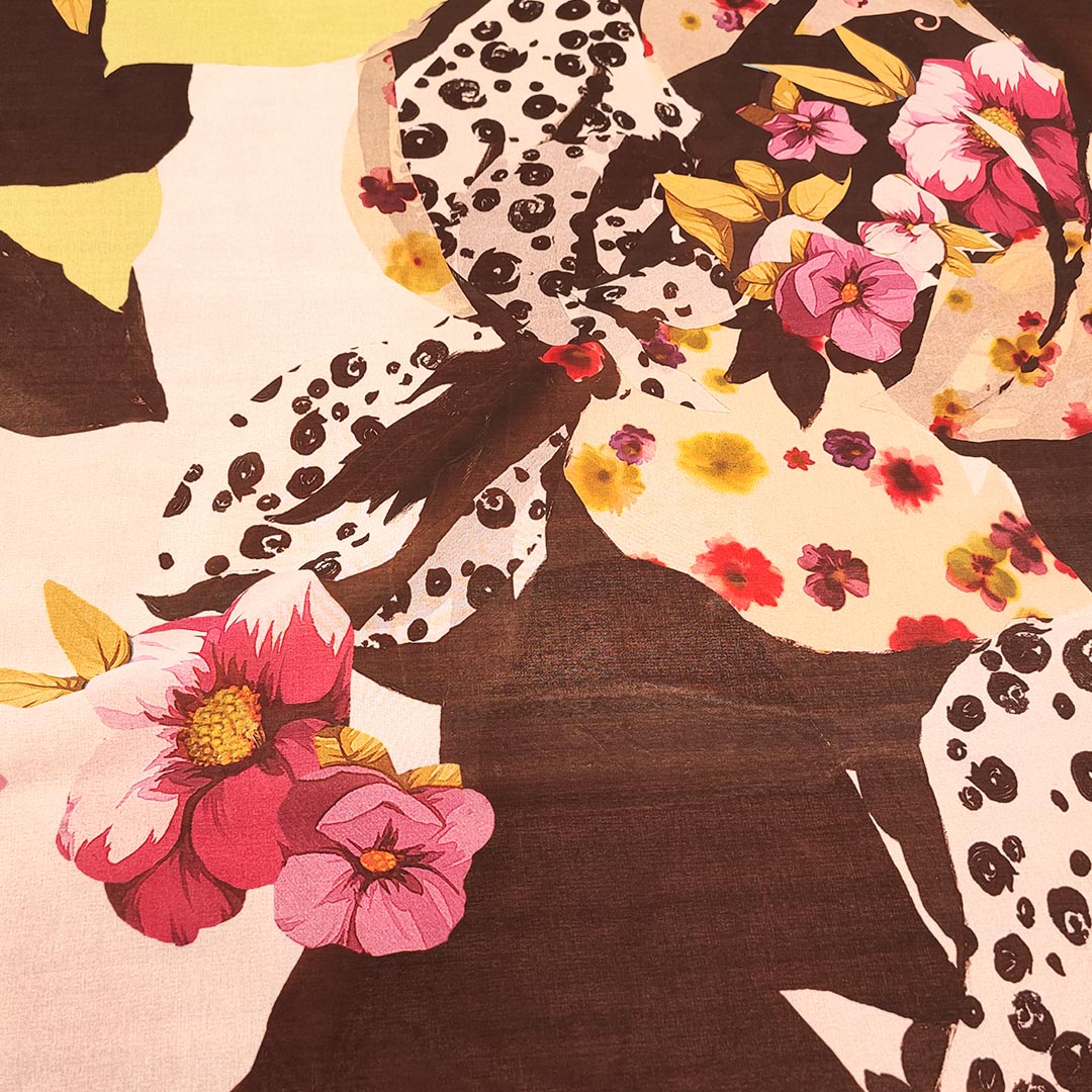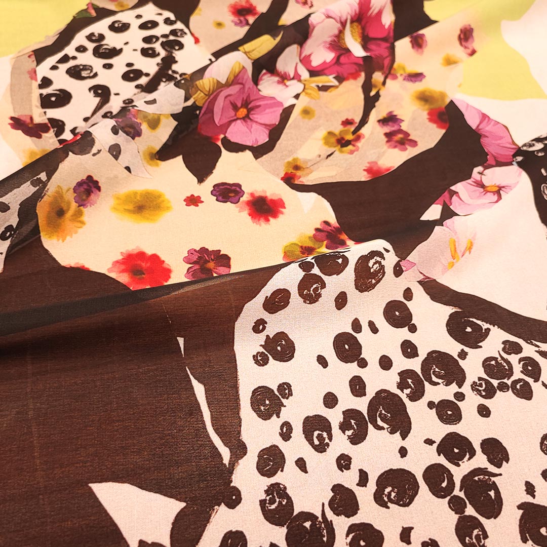 Tessuto Georgette a fantasia dalla mano fine, morbida e granulosa, leggermente trasparente, si presta alla realizzazione di camicie, abiti, gonne e bluse.