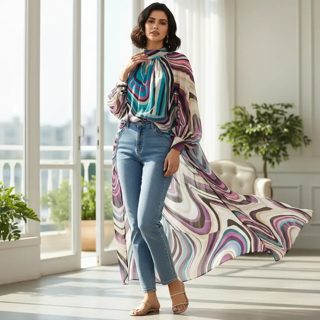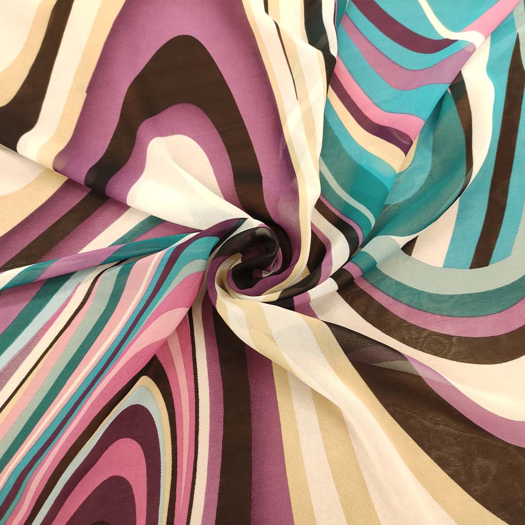 Tessuto Georgette a fantasia dalla mano fine, morbida e granulosa, leggermente trasparente, si presta alla realizzazione di camicie, abiti, gonne e bluse.