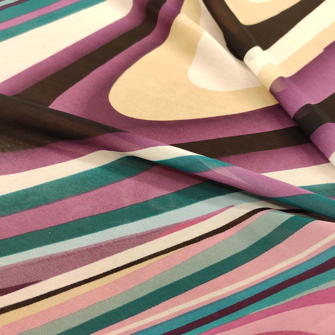 Tessuto Georgette a fantasia motivo astratto nero – petrolio – bianco – glicine