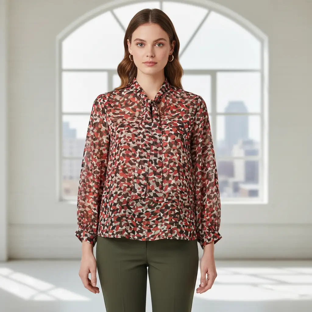 Tessuto Georgette a fantasia dalla mano fine, morbida e granulosa, leggermente trasparente, si presta alla realizzazione di camicie, abiti, gonne e bluse.