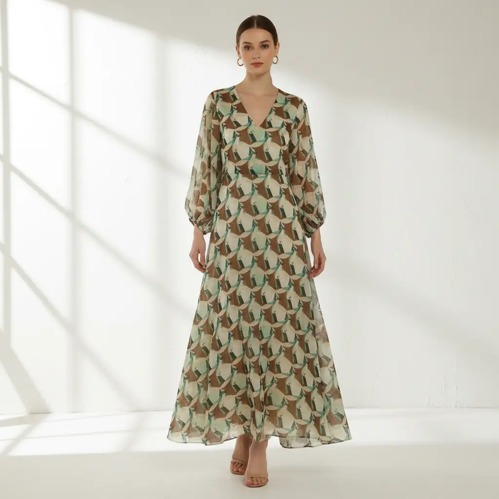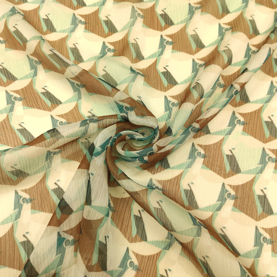 Tessuto Georgette a fantasia dalla mano fine, morbida e granulosa, leggermente trasparente, si presta alla realizzazione di camicie, abiti, gonne e bluse.