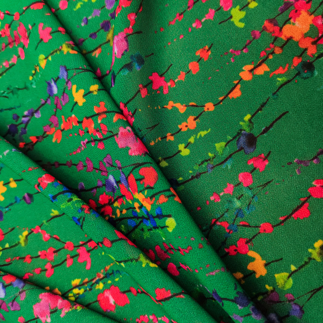 Tessuto Georgette a fantasia motivo astratto verde – fucsia – blu elettrico