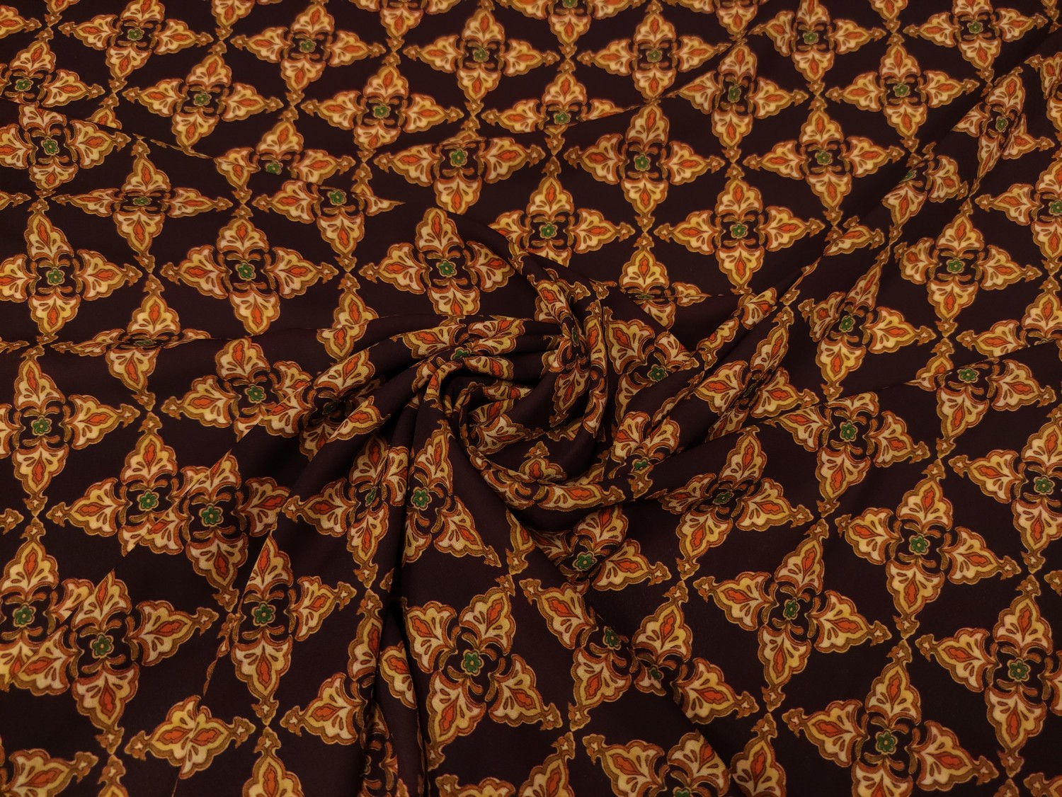 Tessuto Georgette a fantasia motivo etnico bordeaux – arancione
