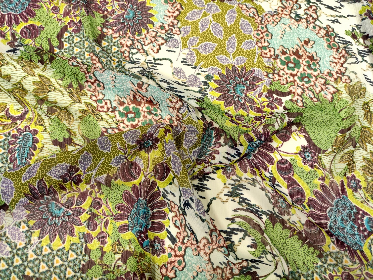 Tessuto Georgette a fantasia dalla mano fine, morbida e granulosa, leggermente trasparente, si presta alla realizzazione di camicie, abiti, gonne e bluse.