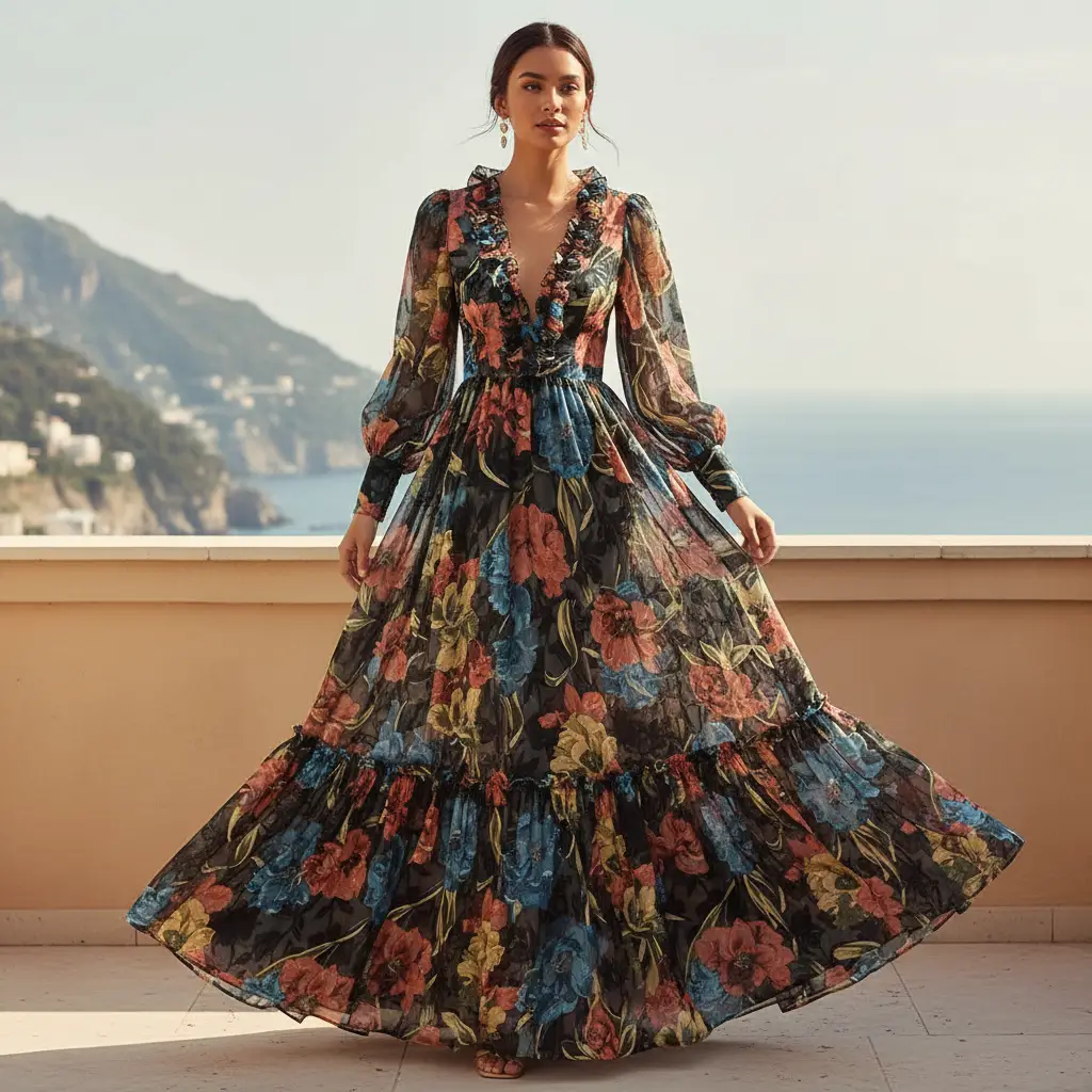 Tessuto Georgette a fantasia dalla mano fine, morbida e granulosa, leggermente trasparente, si presta alla realizzazione di camicie, abiti, gonne e bluse.