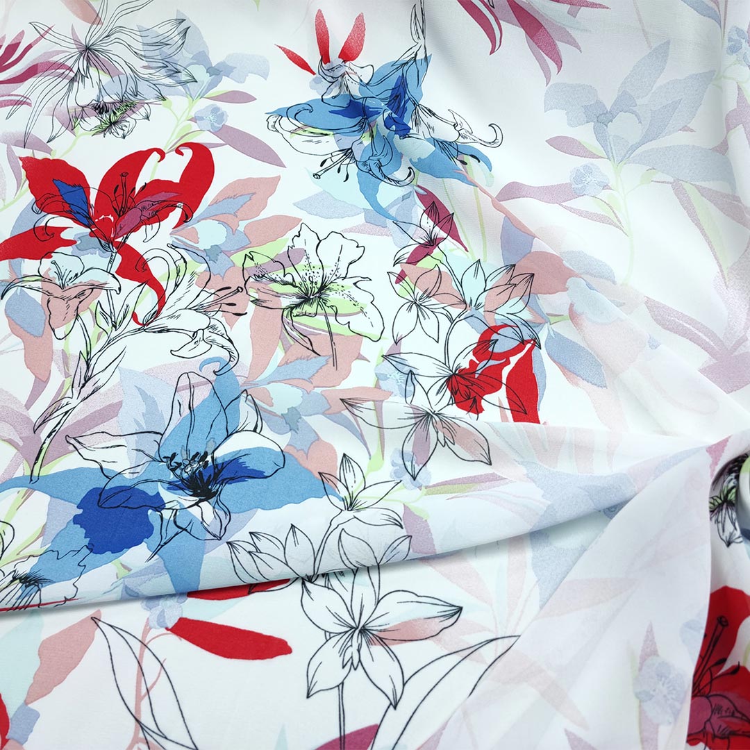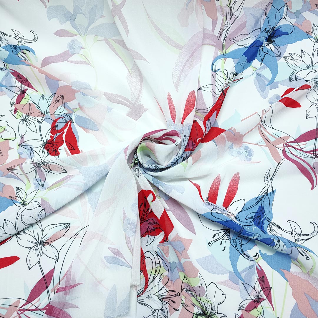 Tessuto Georgette a fantasia dalla mano fine, morbida e granulosa, leggermente trasparente, si presta alla realizzazione di camicie, abiti, gonne e bluse.