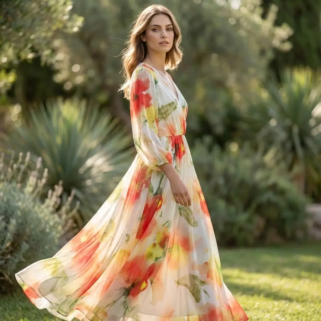 Tessuto Georgette a fantasia dalla mano fine, morbida e granulosa, leggermente trasparente, si presta alla realizzazione di camicie, abiti, gonne e bluse.