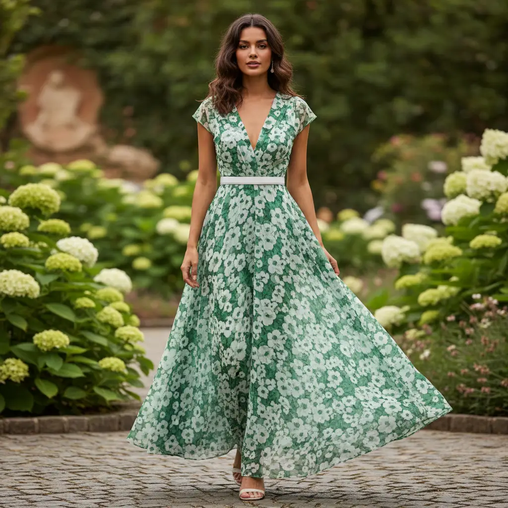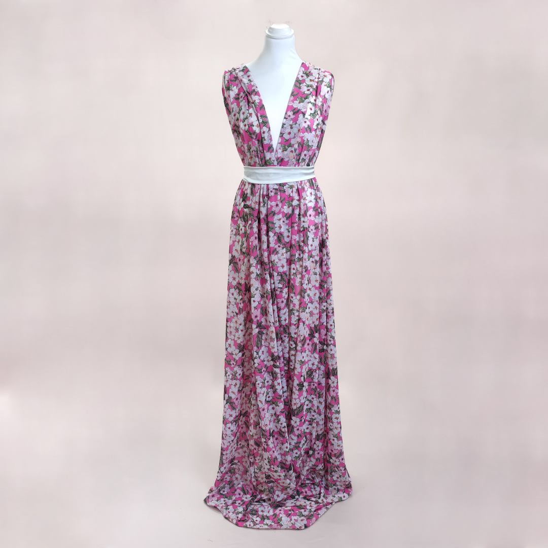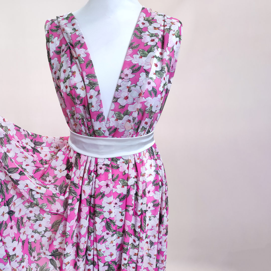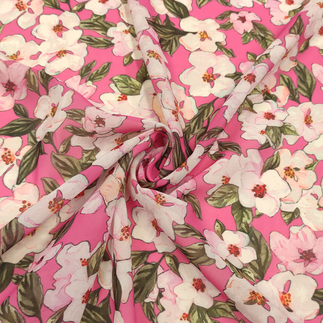 Tessuto Georgette a fantasia dalla mano fine, morbida e granulosa, leggermente trasparente, si presta alla realizzazione di camicie, abiti, gonne e bluse.