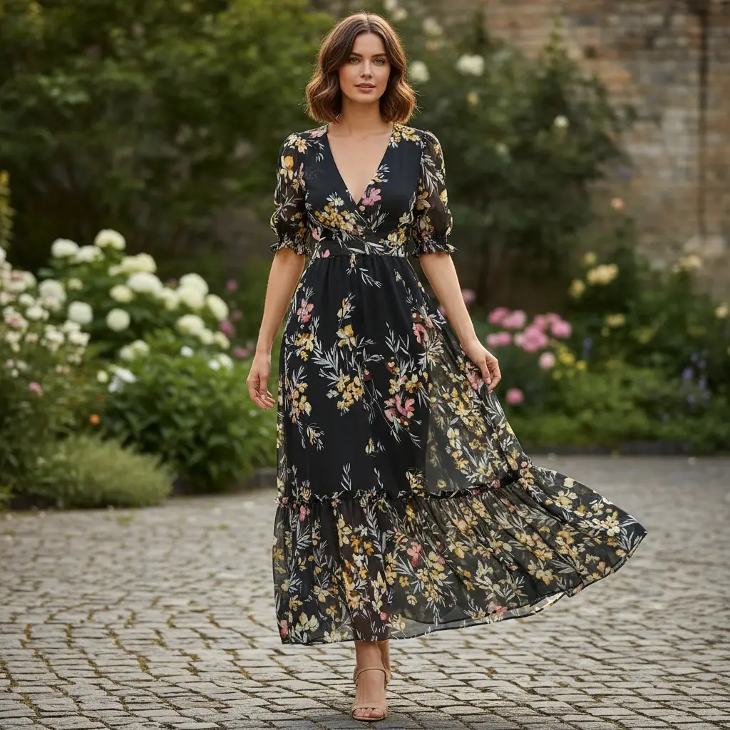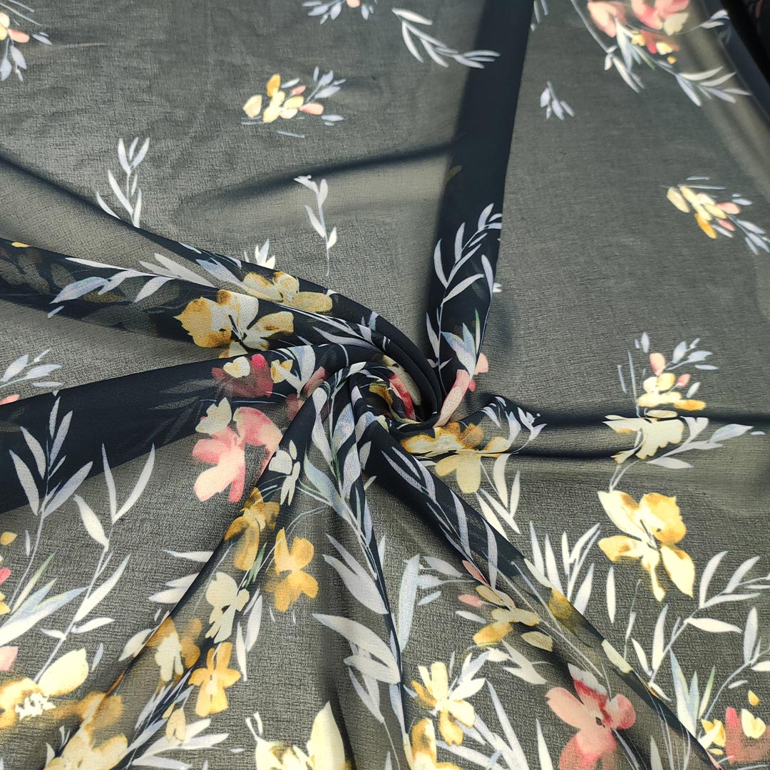 Tessuto Georgette a fantasia dalla mano fine, morbida e granulosa, leggermente trasparente, si presta alla realizzazione di camicie, abiti, gonne e bluse.