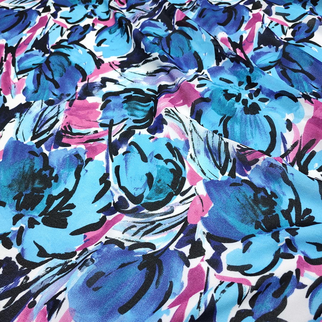 Tessuto Georgette a fantasia dalla mano fine, morbida e granulosa, leggermente trasparente, si presta alla realizzazione di camicie, abiti, gonne e bluse.