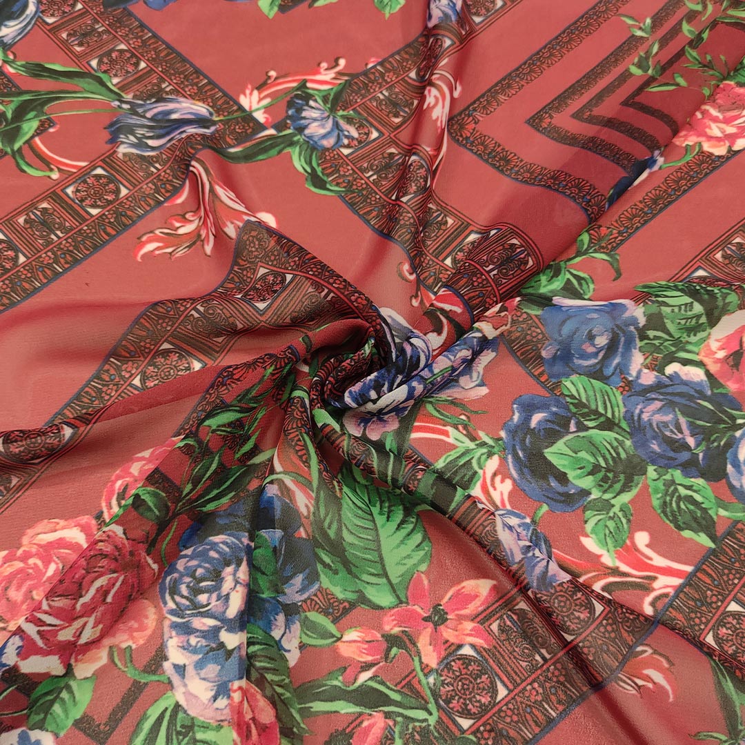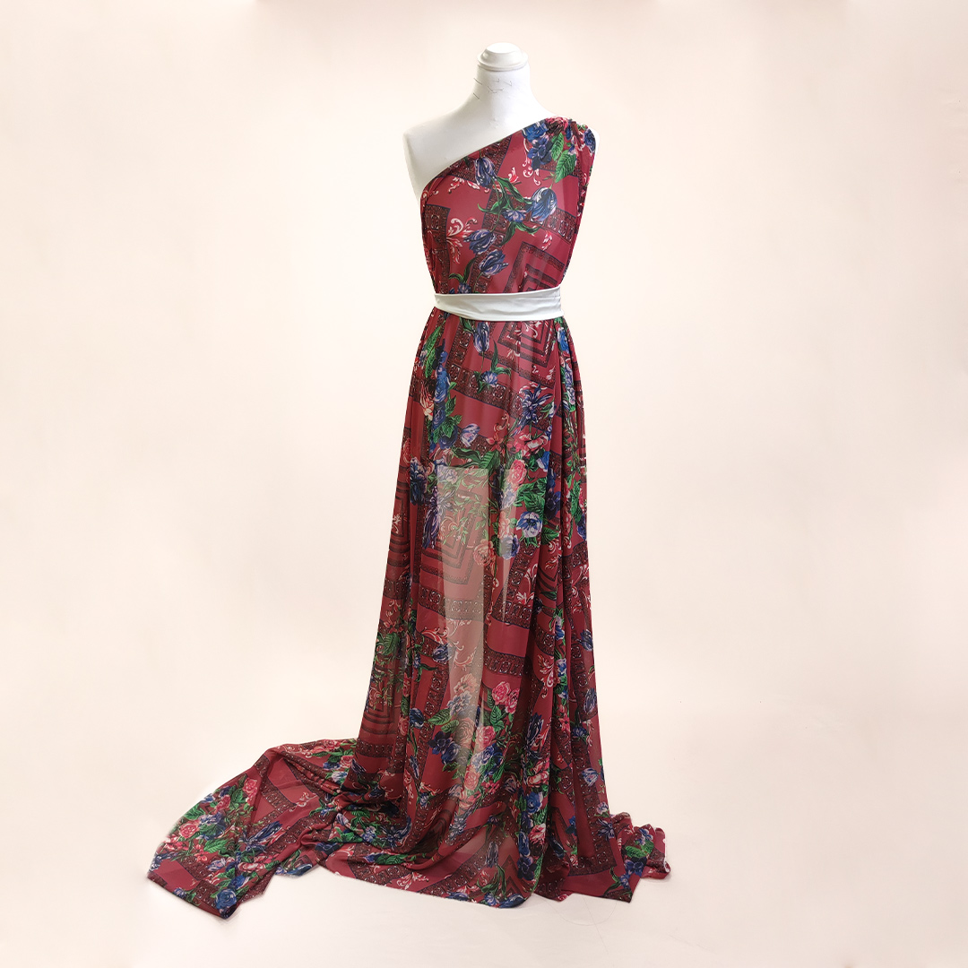 Tessuto Georgette a fantasia dalla mano fine, morbida e granulosa, leggermente trasparente, si presta alla realizzazione di camicie, abiti, gonne e bluse.
