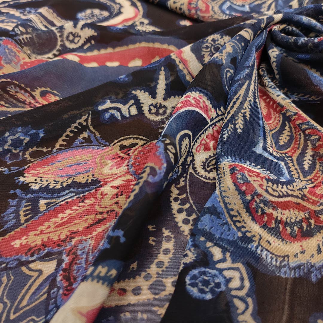Tessuto Georgette a fantasia dalla mano fine, morbida e granulosa, leggermente trasparente, si presta alla realizzazione di camicie, abiti, gonne e bluse.