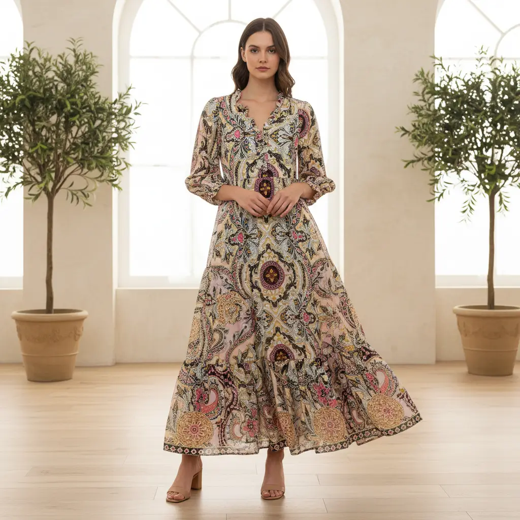 Tessuto Georgette a fantasia dalla mano fine, morbida e granulosa, leggermente trasparente, si presta alla realizzazione di camicie, abiti, gonne e bluse.