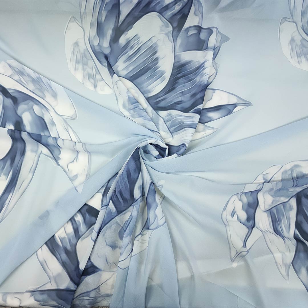 Tessuto Georgette a fantasia dalla mano fine, morbida e granulosa, leggermente trasparente, si presta alla realizzazione di camicie, abiti, gonne e bluse.
