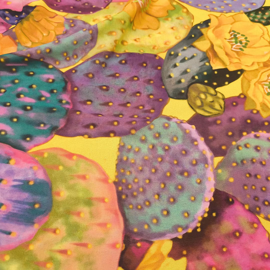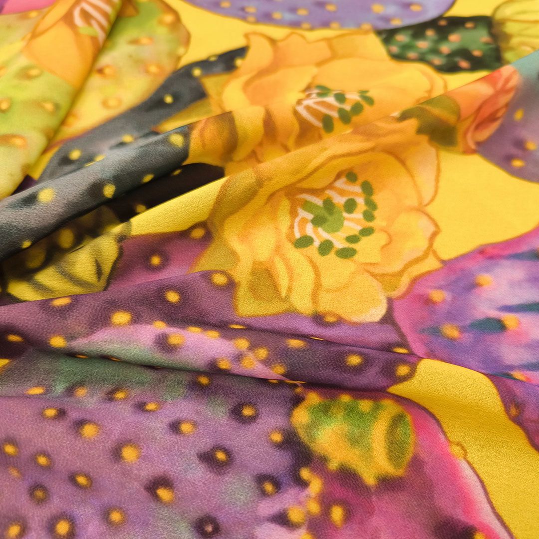 Tessuto Georgette a fantasia dalla mano fine, morbida e granulosa, leggermente trasparente, si presta alla realizzazione di camicie, abiti, gonne e bluse.
