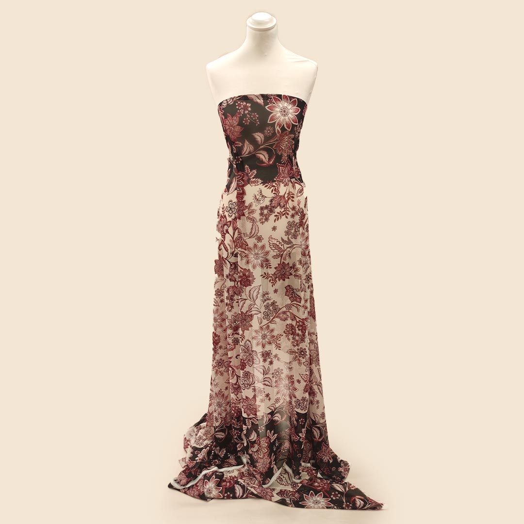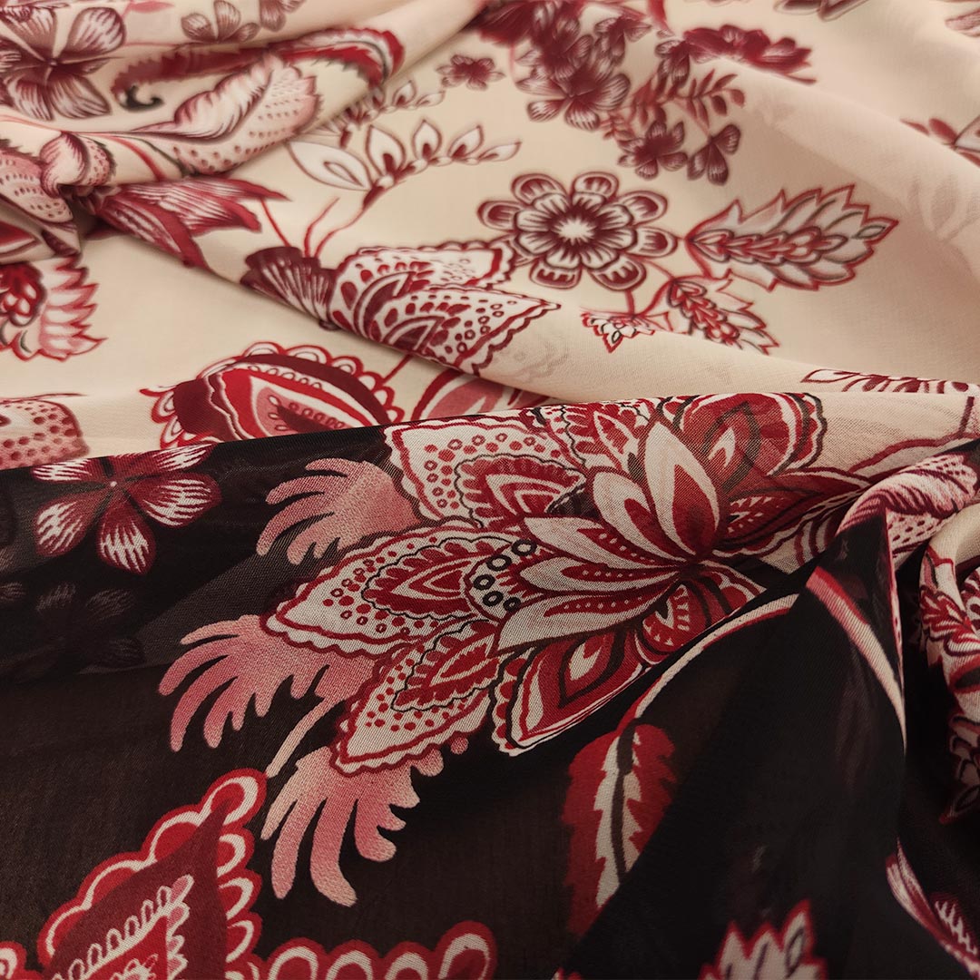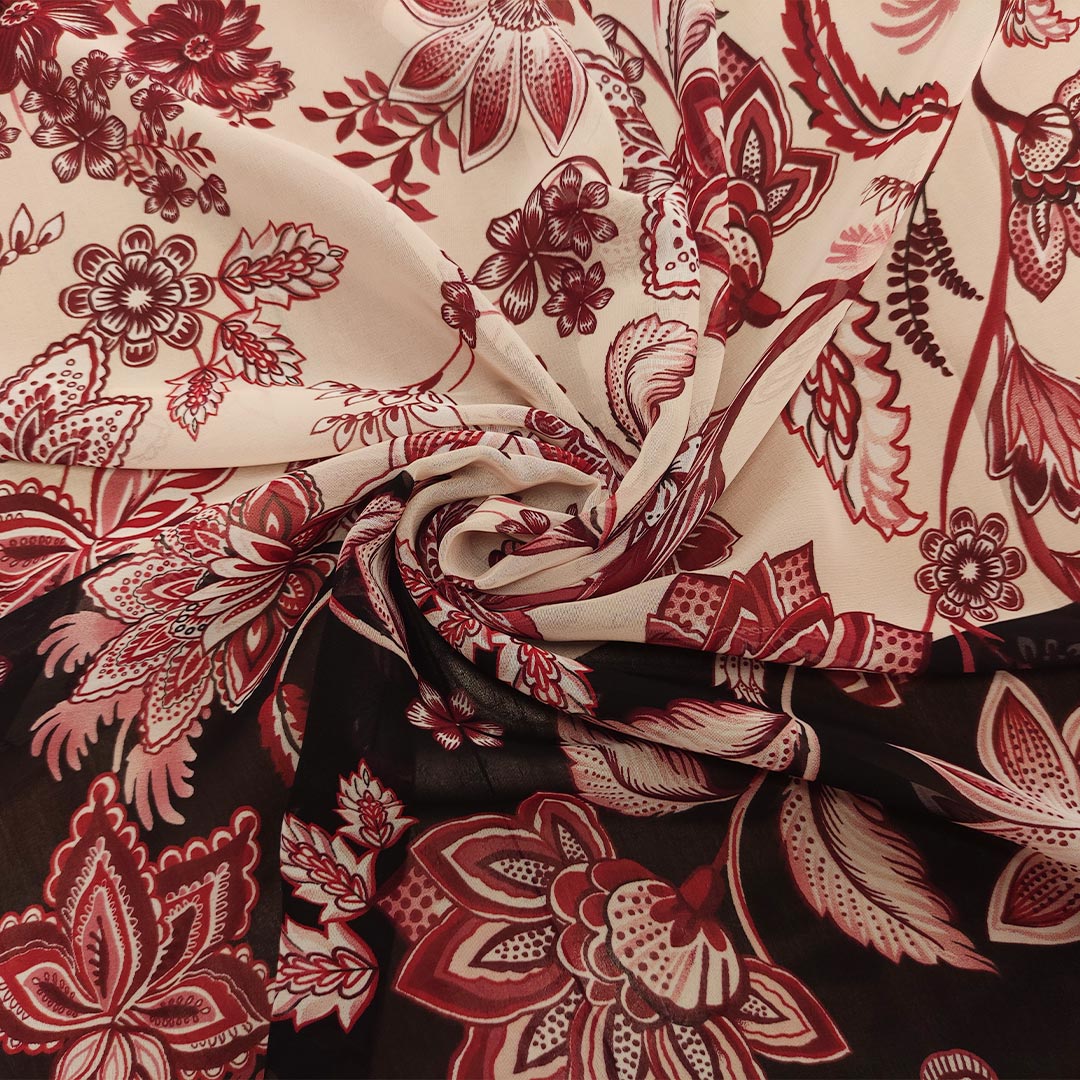 Tessuto Georgette a fantasia dalla mano fine, morbida e granulosa, leggermente trasparente, si presta alla realizzazione di camicie, abiti, gonne e bluse.