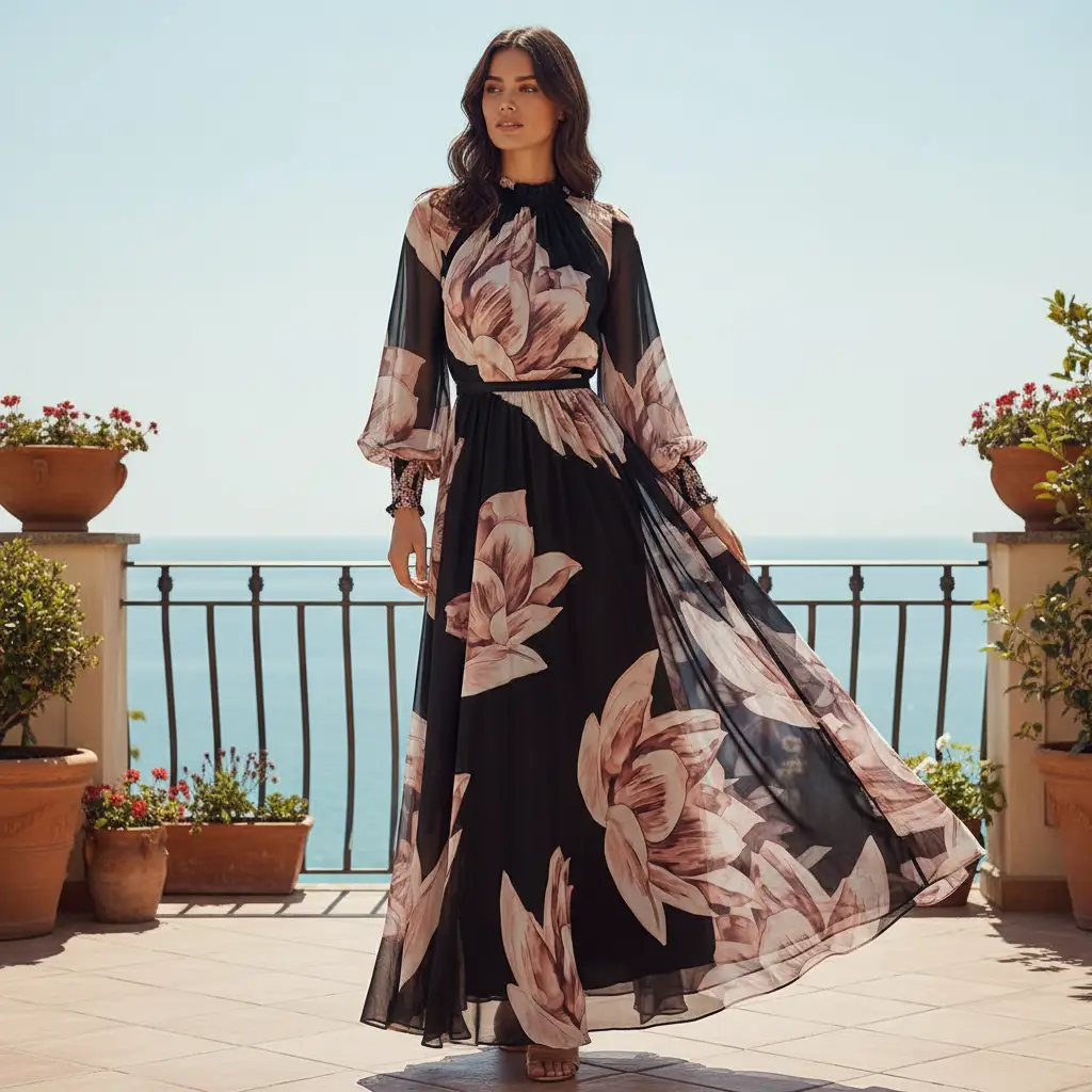 Tessuto Georgette a fantasia dalla mano fine, morbida e granulosa, leggermente trasparente, si presta alla realizzazione di camicie, abiti, gonne e bluse.