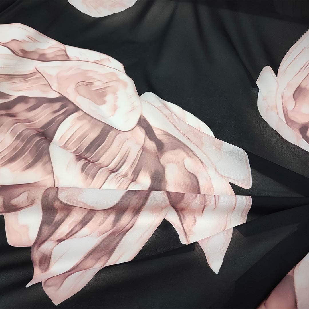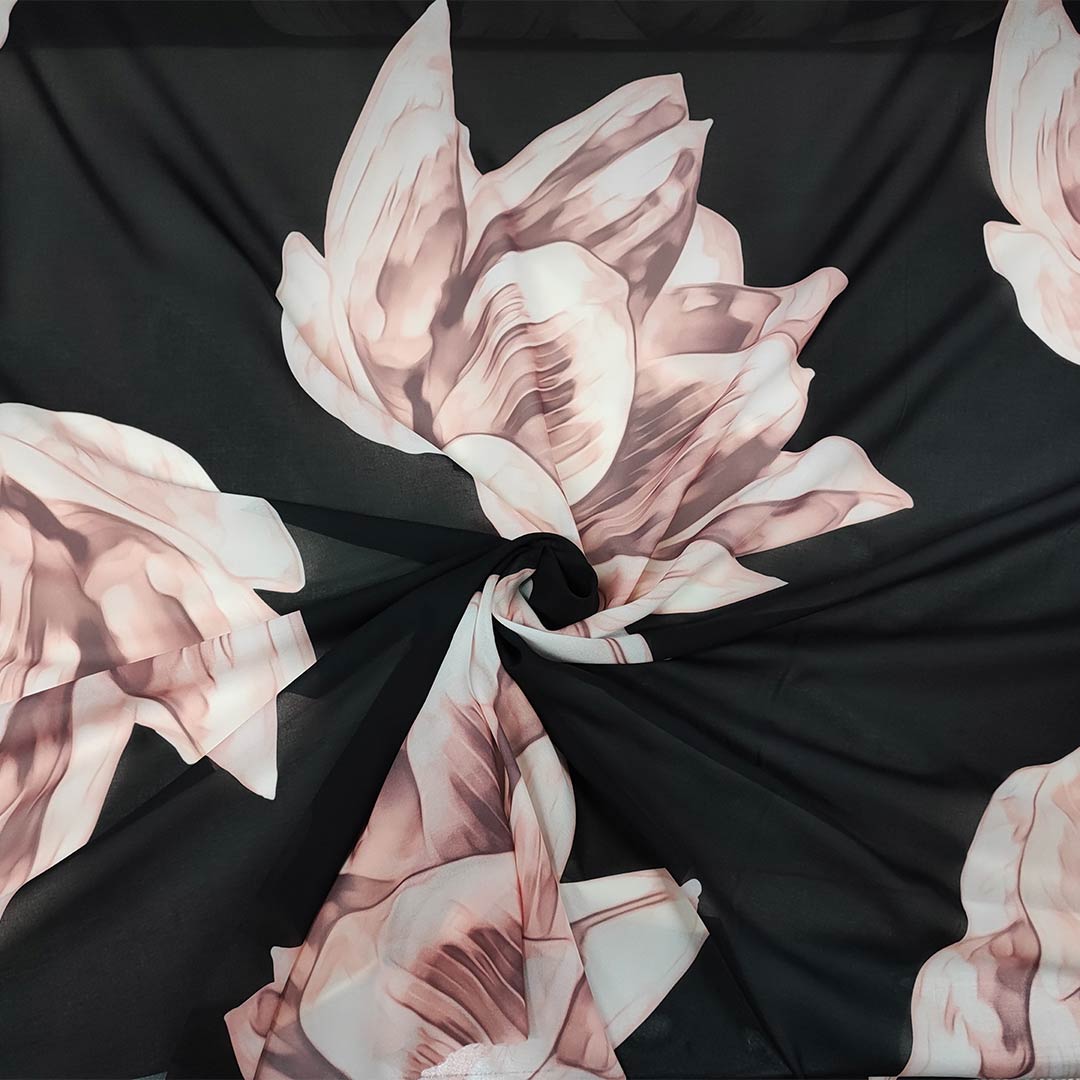 Tessuto Georgette a fantasia motivo floreale nero – rosa cipria