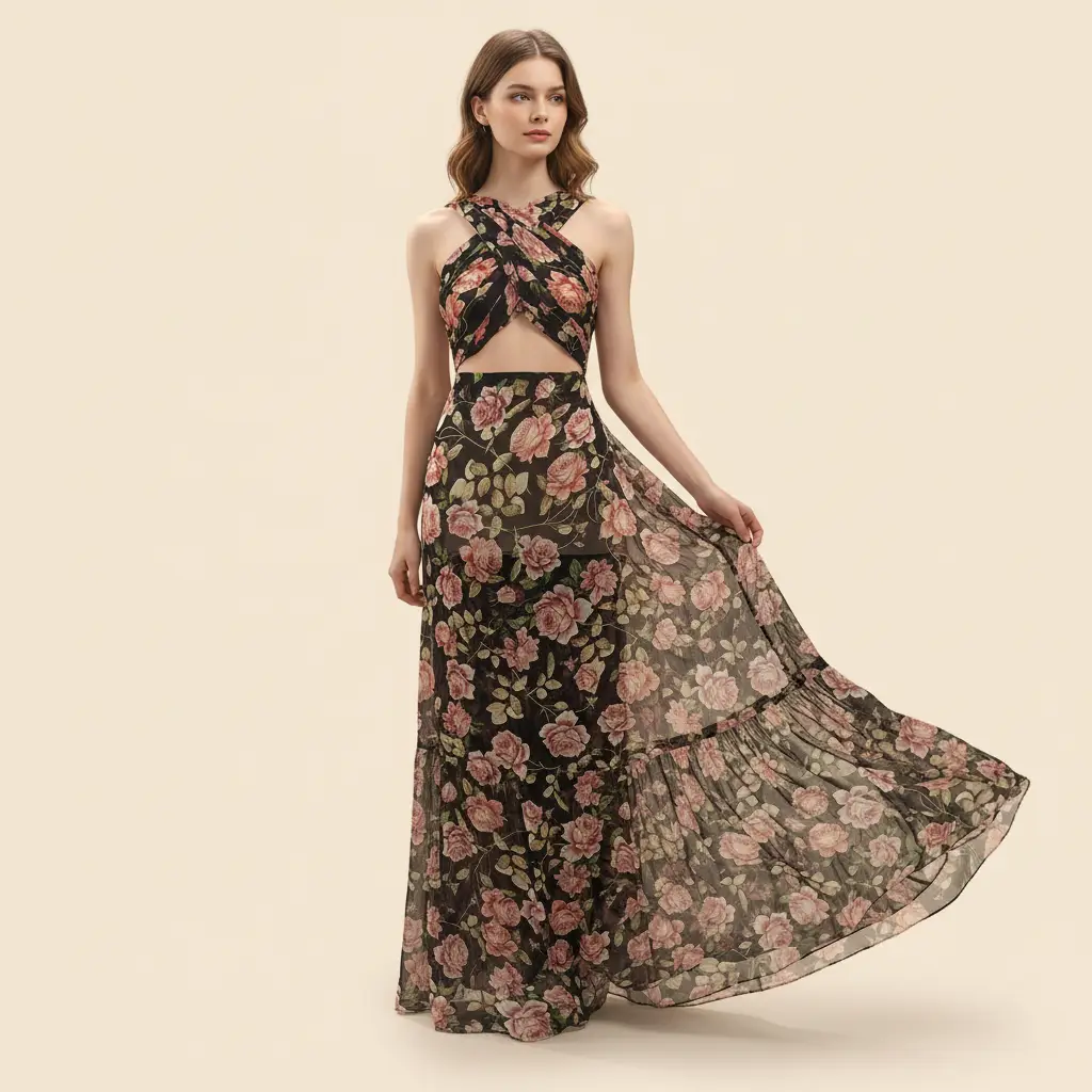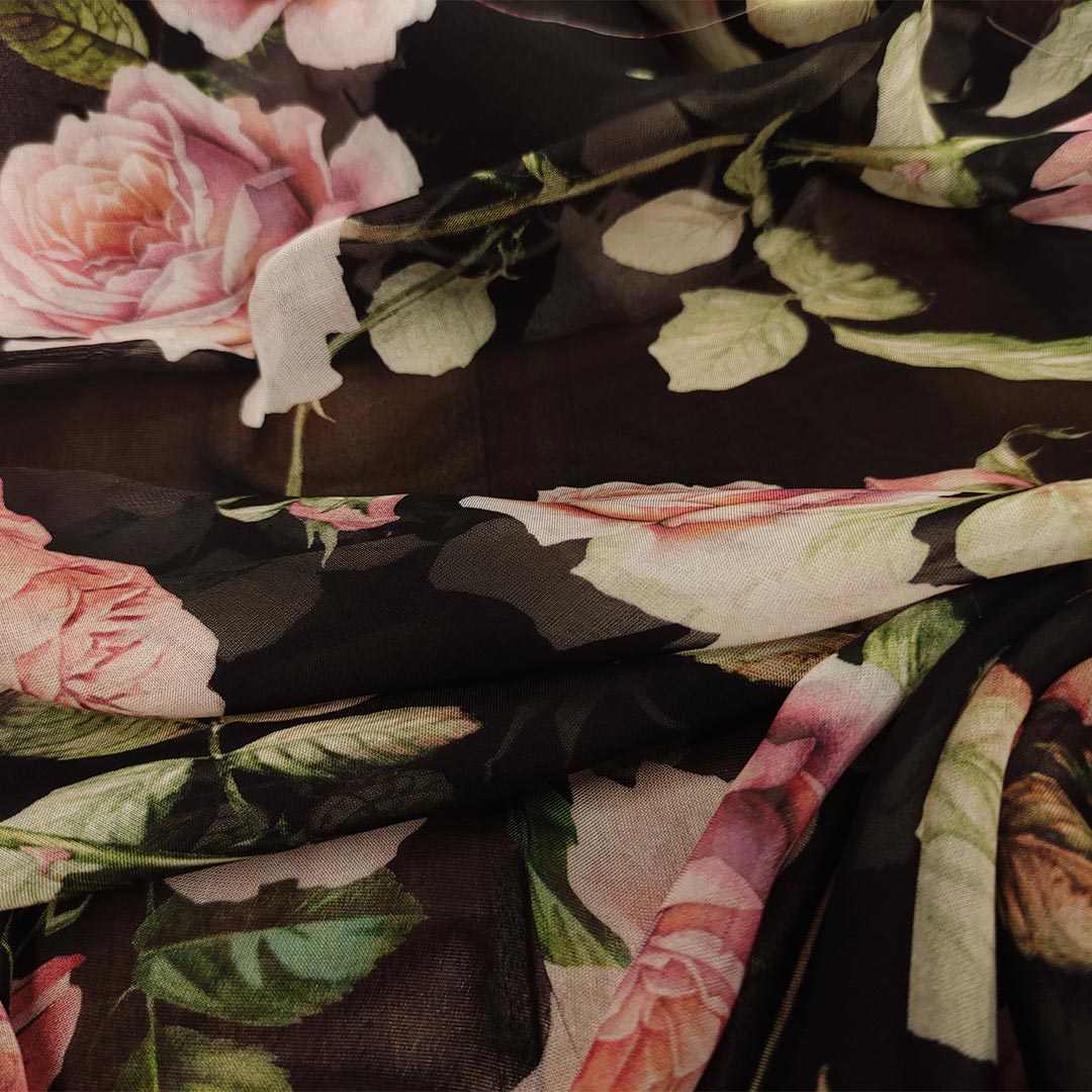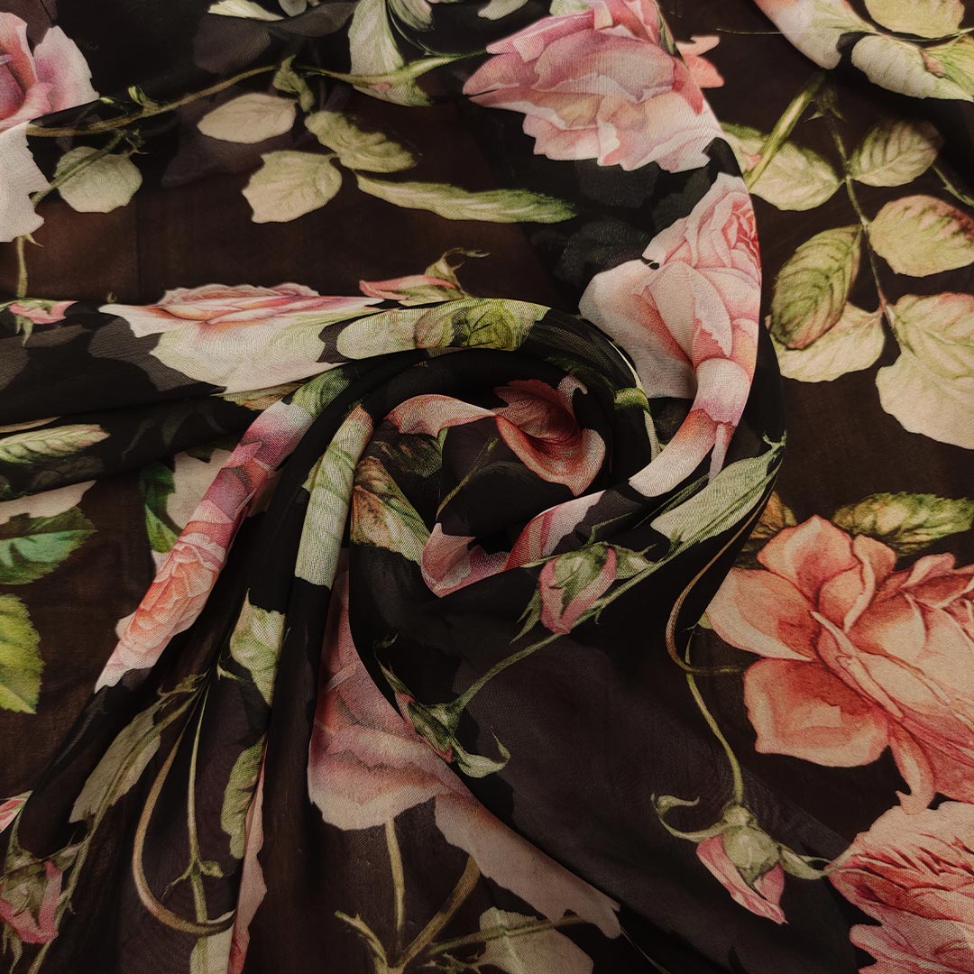 Tessuto Georgette a fantasia motivo floreale nero – rosa – verde