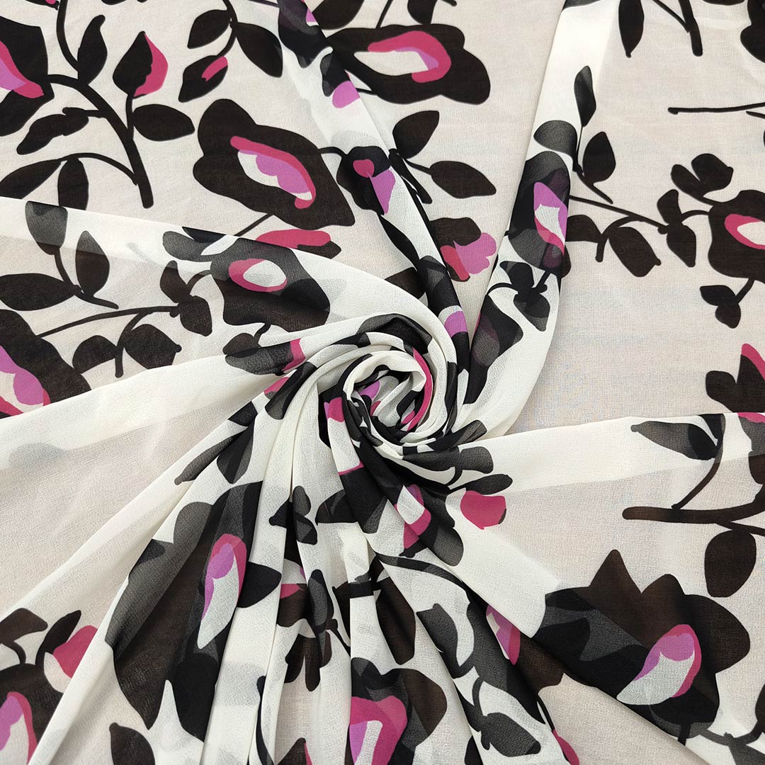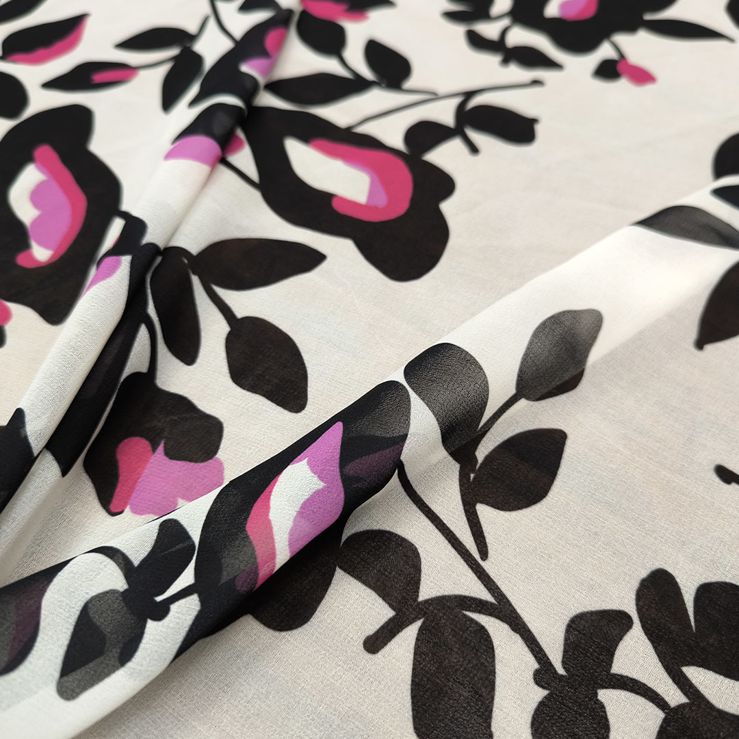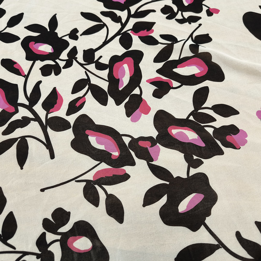 Tessuto Georgette a fantasia motivo floreale panna – nero – orchidea