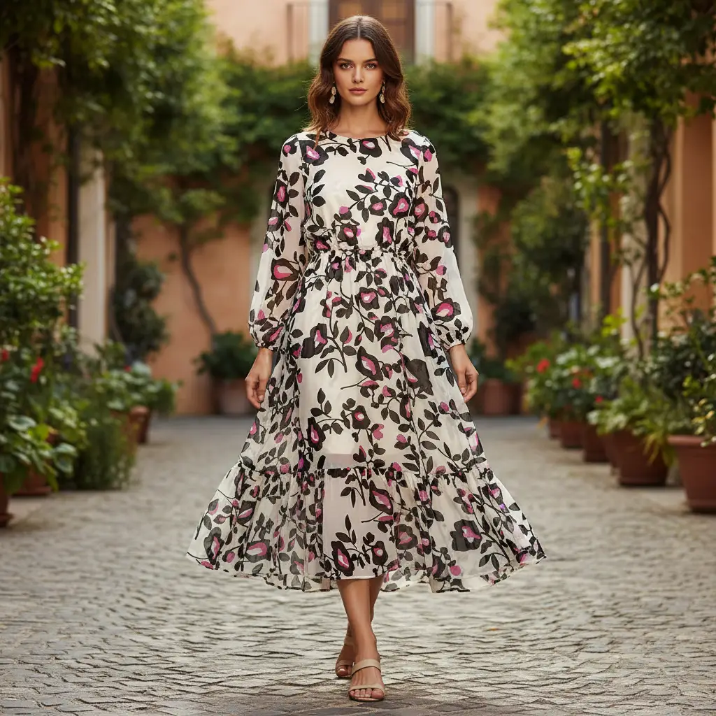 Tessuto Georgette a fantasia dalla mano fine, morbida e granulosa, leggermente trasparente, si presta alla realizzazione di camicie, abiti, gonne e bluse.