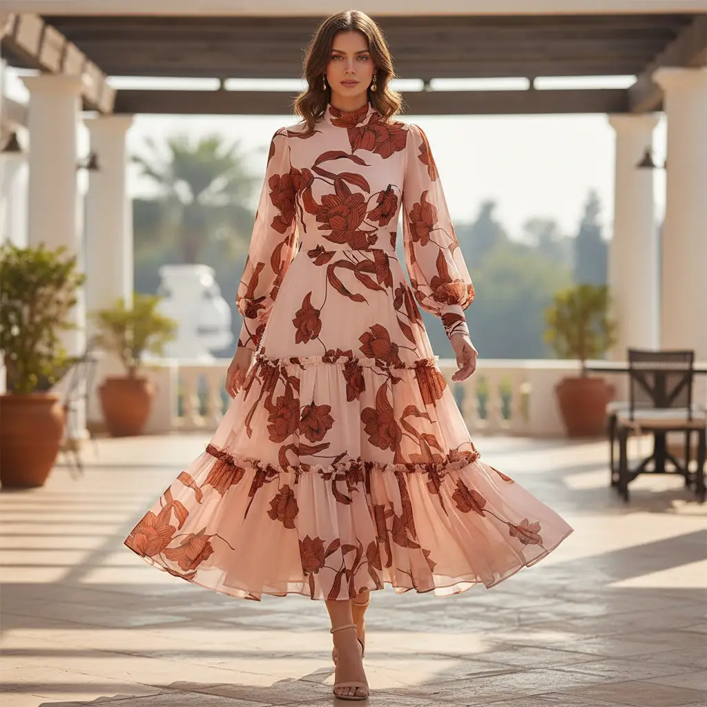Tessuto Georgette a fantasia dalla mano fine, morbida e granulosa, leggermente trasparente, si presta alla realizzazione di camicie, abiti, gonne e bluse.