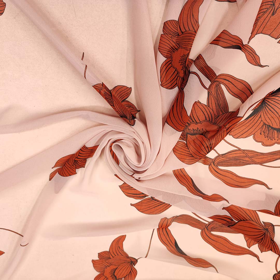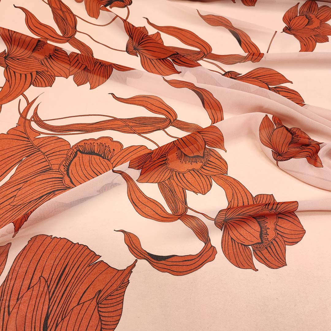 Tessuto Georgette a fantasia motivo floreale rosa – aragosta
