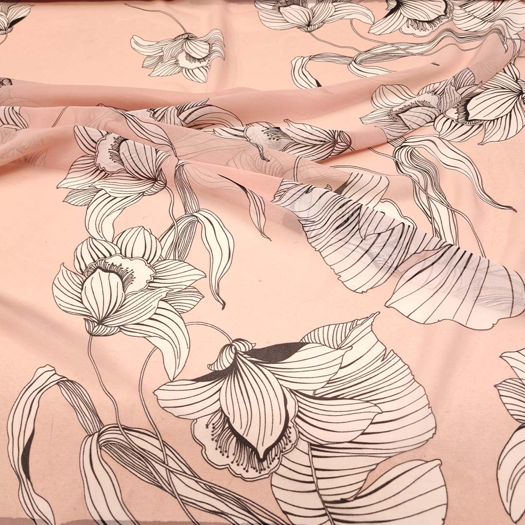 Tessuto Georgette a fantasia motivo floreale rosa – bianco – nero