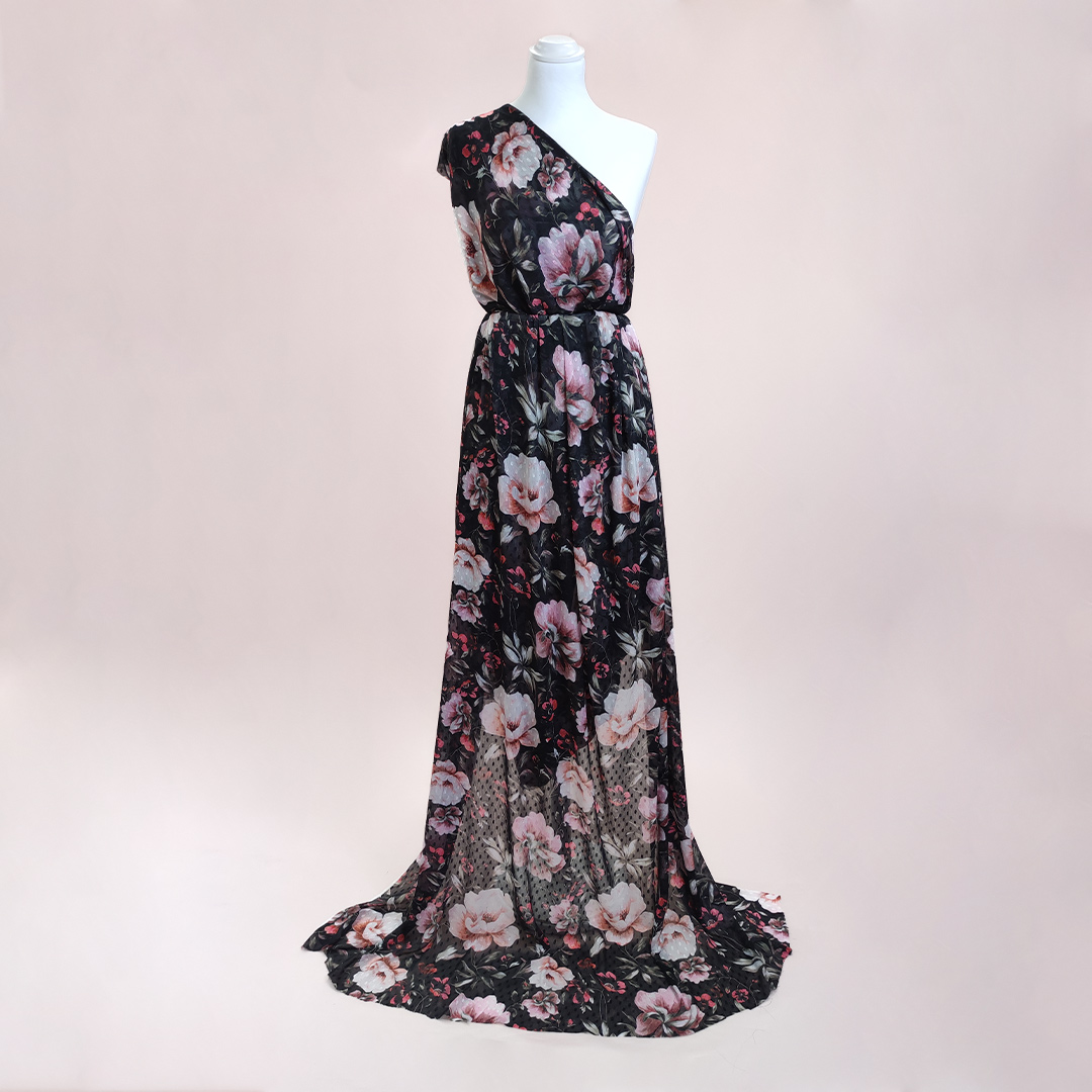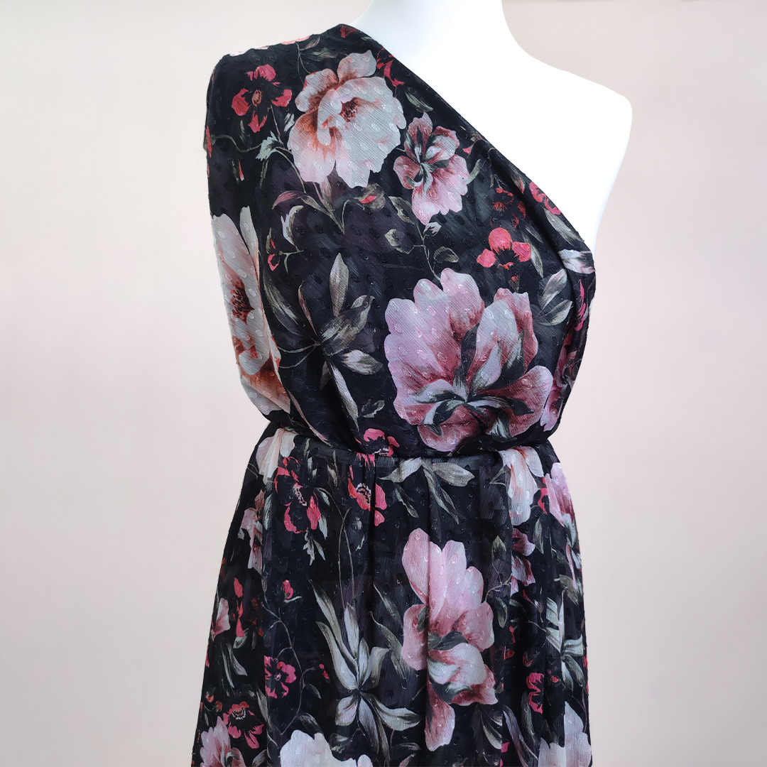 Tessuto Georgette a fantasia dalla mano fine, morbida e granulosa, leggermente trasparente, si presta alla realizzazione di camicie, abiti, gonne e bluse.