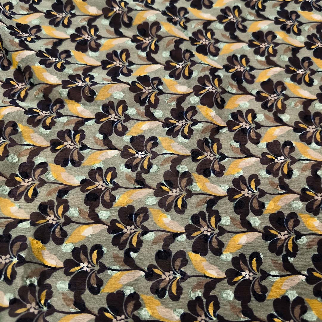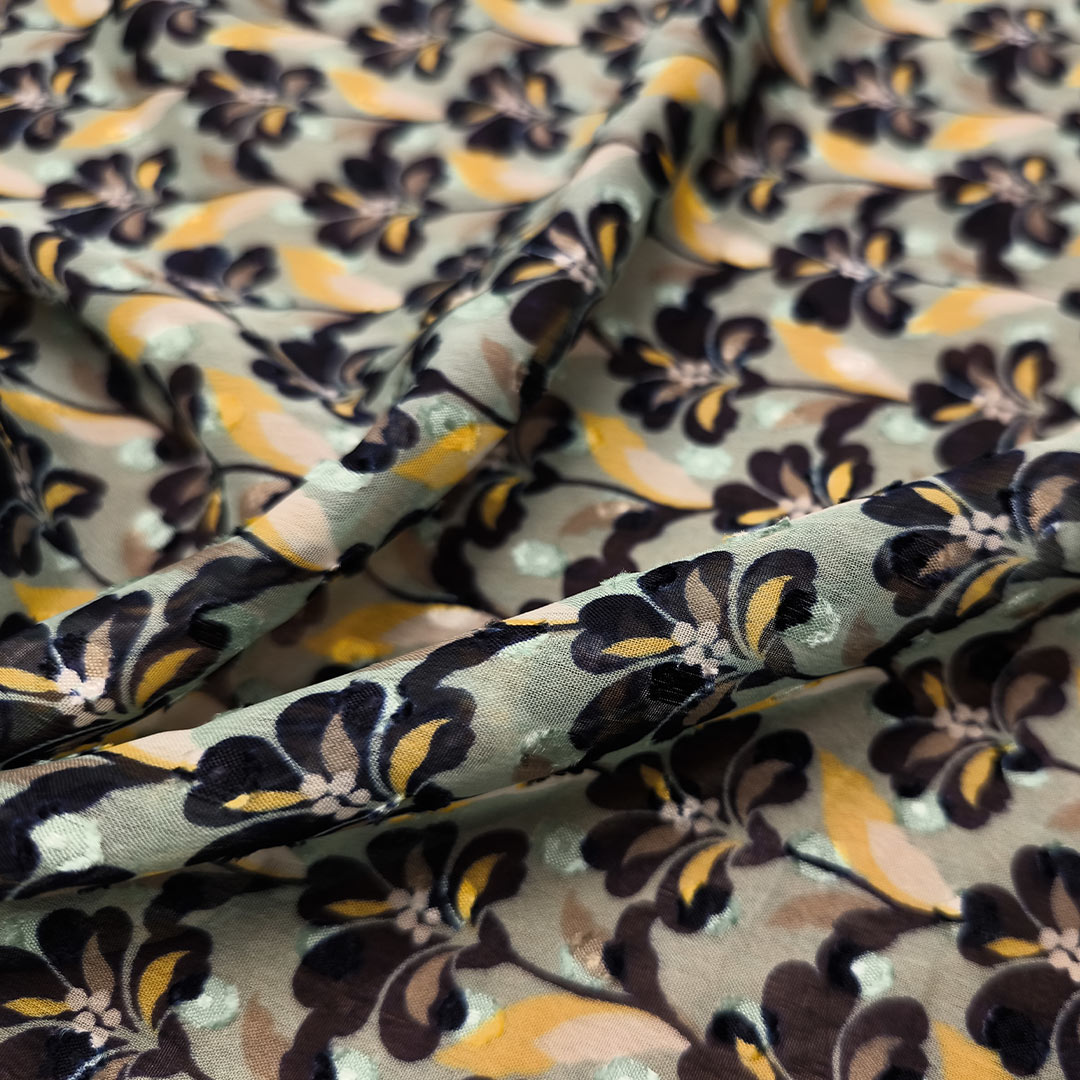 Tessuto Georgette a fantasia dalla mano fine, morbida e granulosa, leggermente trasparente, si presta alla realizzazione di camicie, abiti, gonne e bluse.