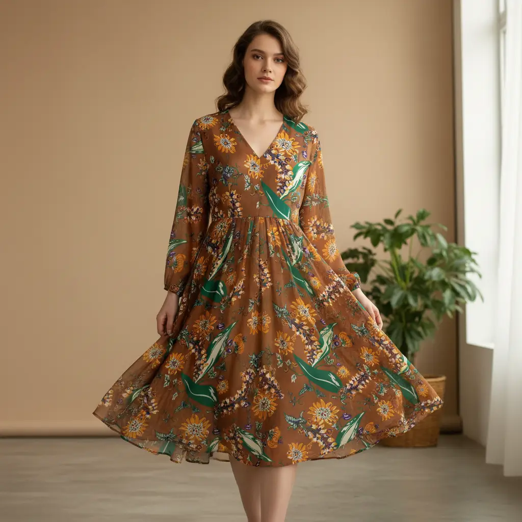 Tessuto Georgette a fantasia motivo floreale verde – marrone