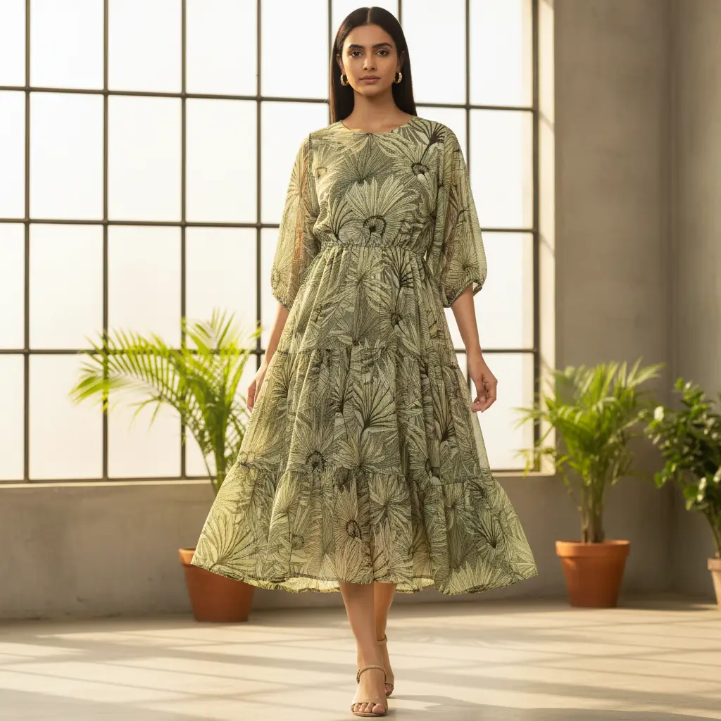Tessuto Georgette a fantasia dalla mano fine, morbida e granulosa, leggermente trasparente, si presta alla realizzazione di camicie, abiti, gonne e bluse.