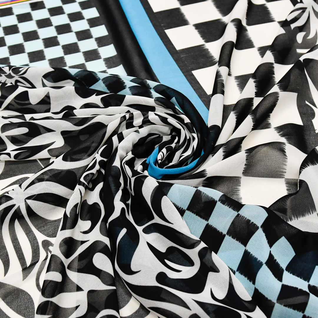 Tessuto Georgette a fantasia dalla mano fine, morbida e granulosa, leggermente trasparente, si presta alla realizzazione di camicie, abiti, gonne e bluse.