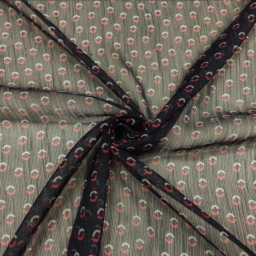 Tessuto Georgette a fantasia dalla mano fine, morbida e granulosa, leggermente trasparente, si presta alla realizzazione di camicie, abiti, gonne e bluse.