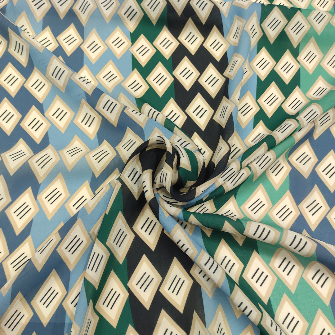 Tessuto Georgette a fantasia motivo geometrico blu – verde – celeste