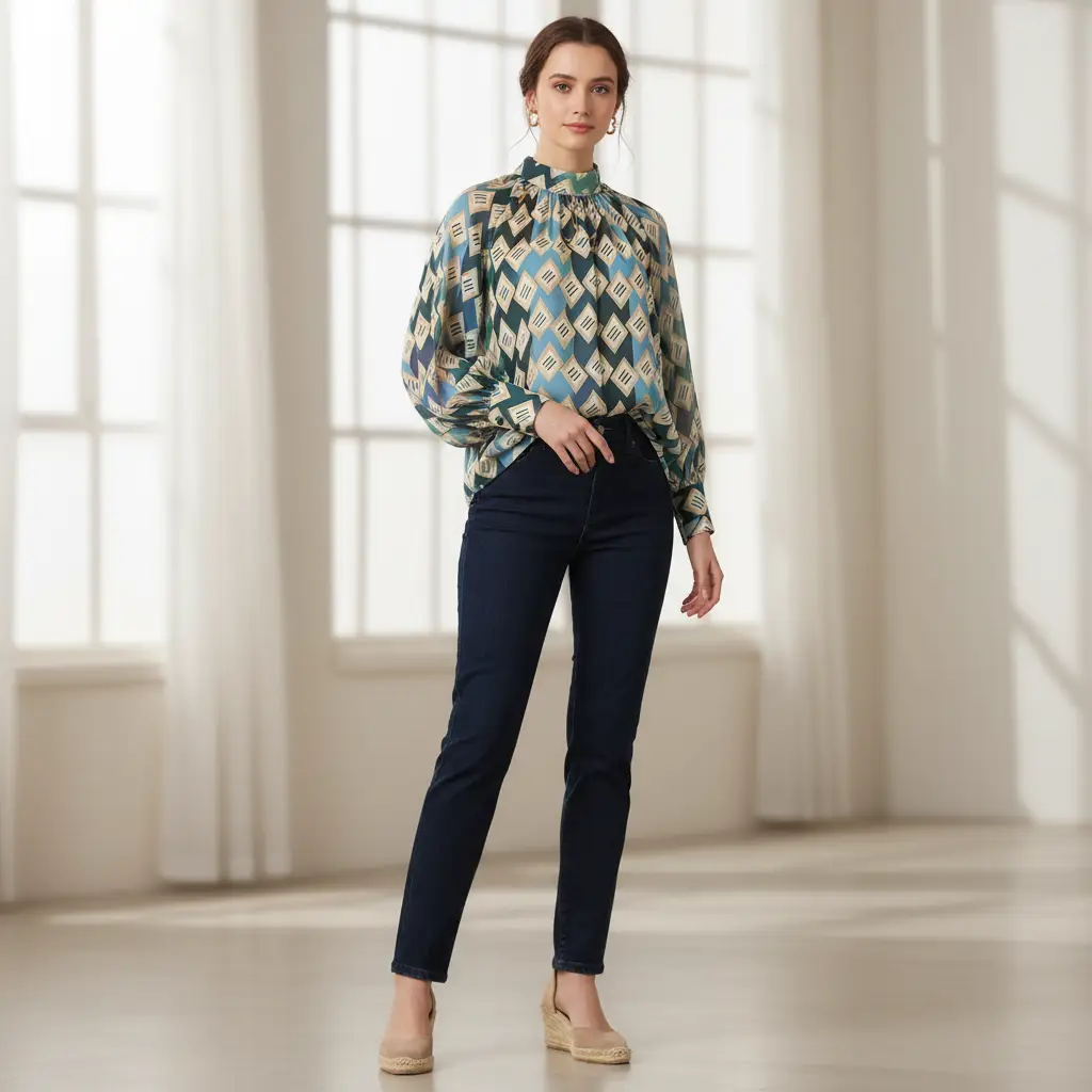 Tessuto Georgette a fantasia dalla mano fine, morbida e granulosa, leggermente trasparente, si presta alla realizzazione di camicie, abiti, gonne e bluse.