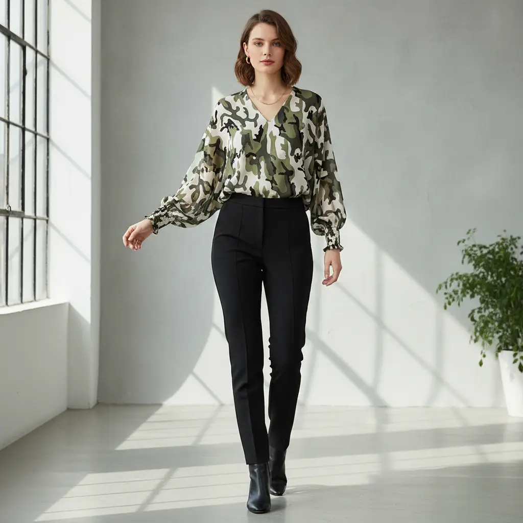 Tessuto Georgette a fantasia motivo mimetico verde – nero – panna