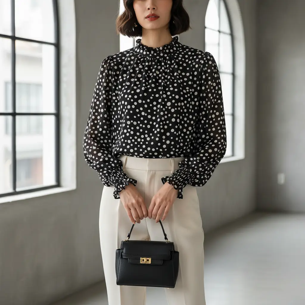 Tessuto Georgette a fantasia dalla mano fine, morbida e granulosa, leggermente trasparente, si presta alla realizzazione di camicie, abiti, gonne e bluse.