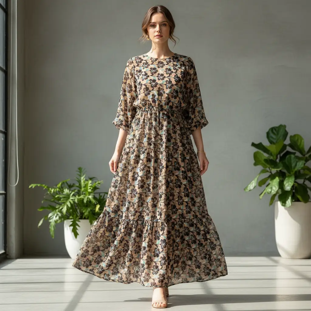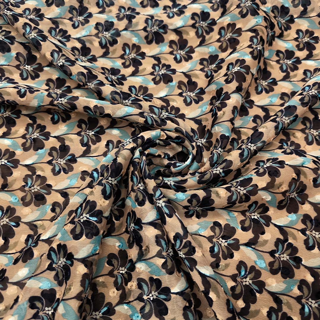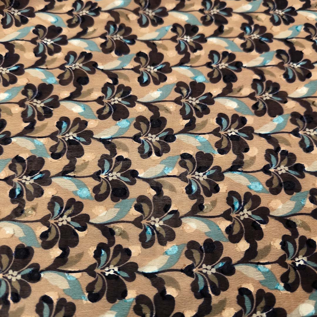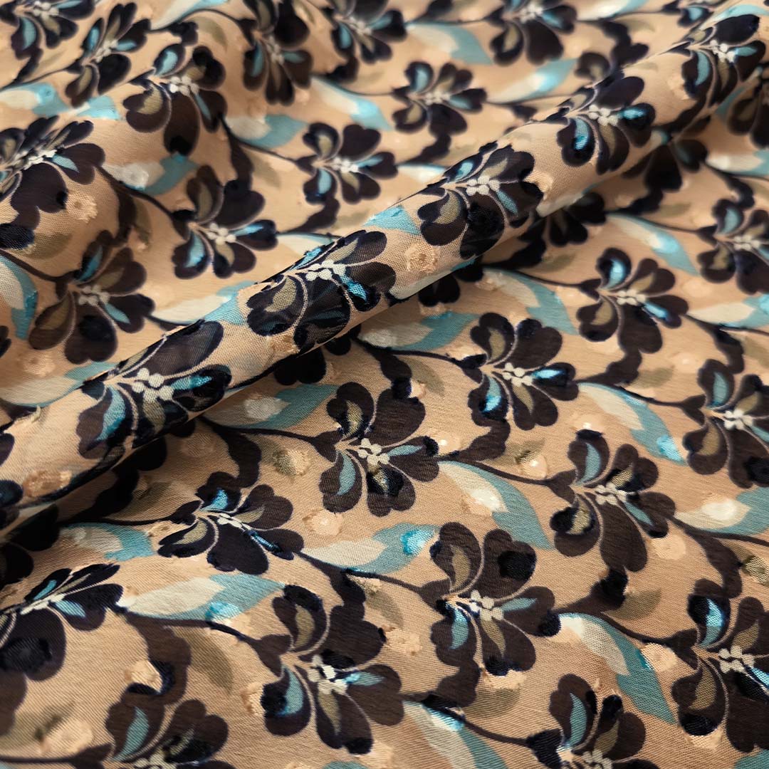 Tessuto Georgette a fantasia dalla mano fine, morbida e granulosa, leggermente trasparente, si presta alla realizzazione di camicie, abiti, gonne e bluse.