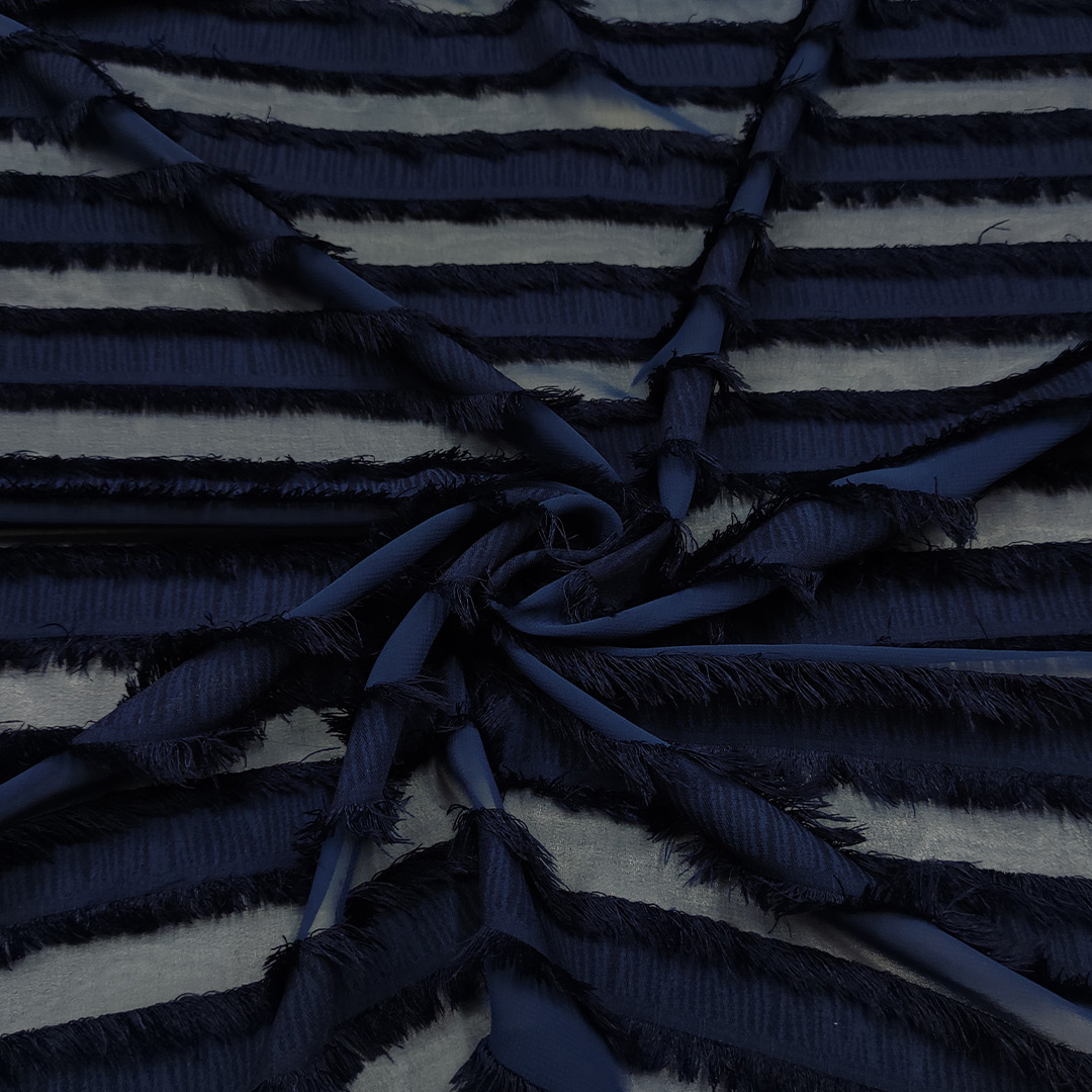 Tessuto Georgette con frange in tinta unita dalla mano fine, morbida e granulosa, leggermente trasparente, si presta alla realizzazione di camicie, abiti, gonne e bluse.