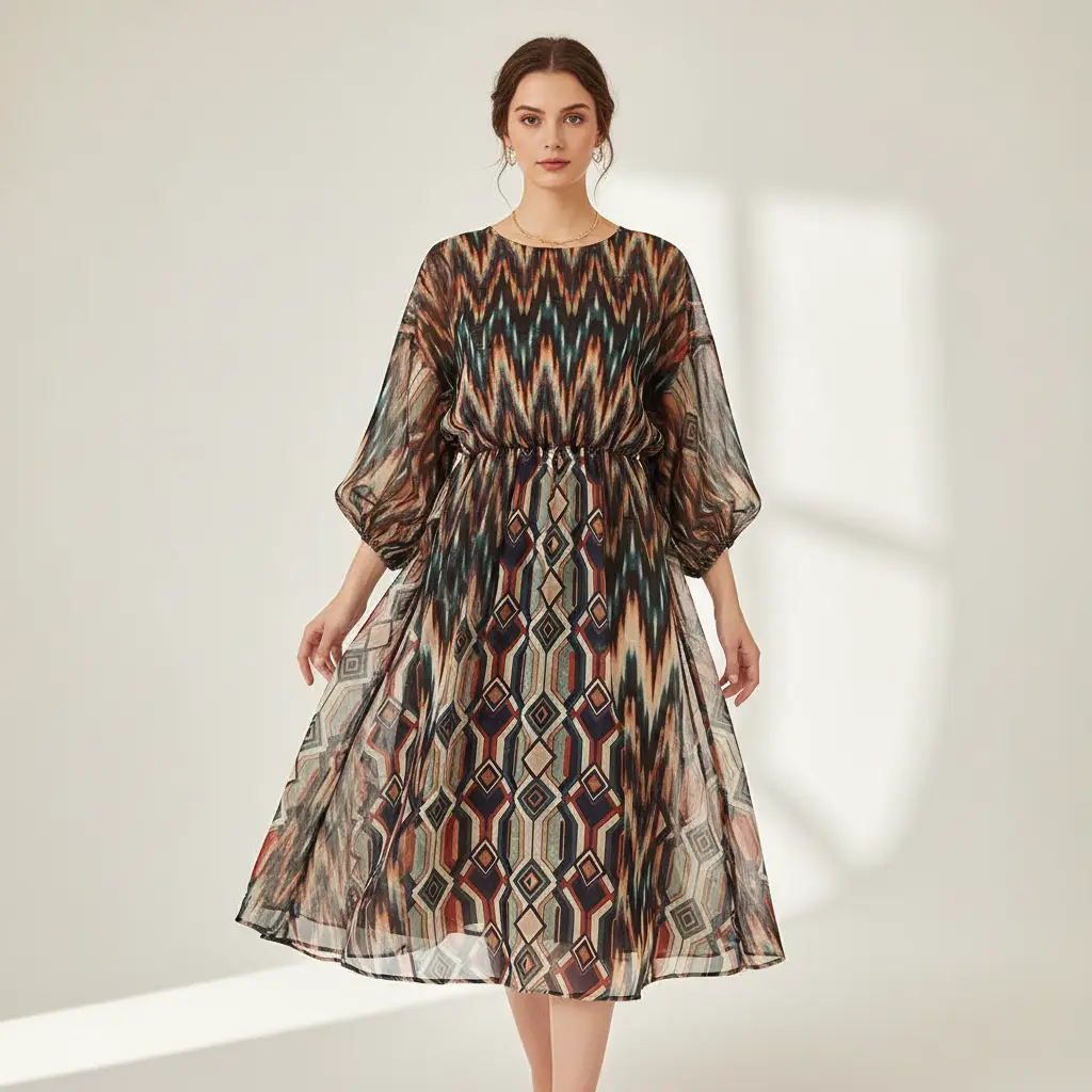 Tessuto Georgette devorè a fantasia dalla mano fine, morbida e granulosa, leggermente trasparente, si presta alla realizzazione di camicie, abiti, gonne e bluse.