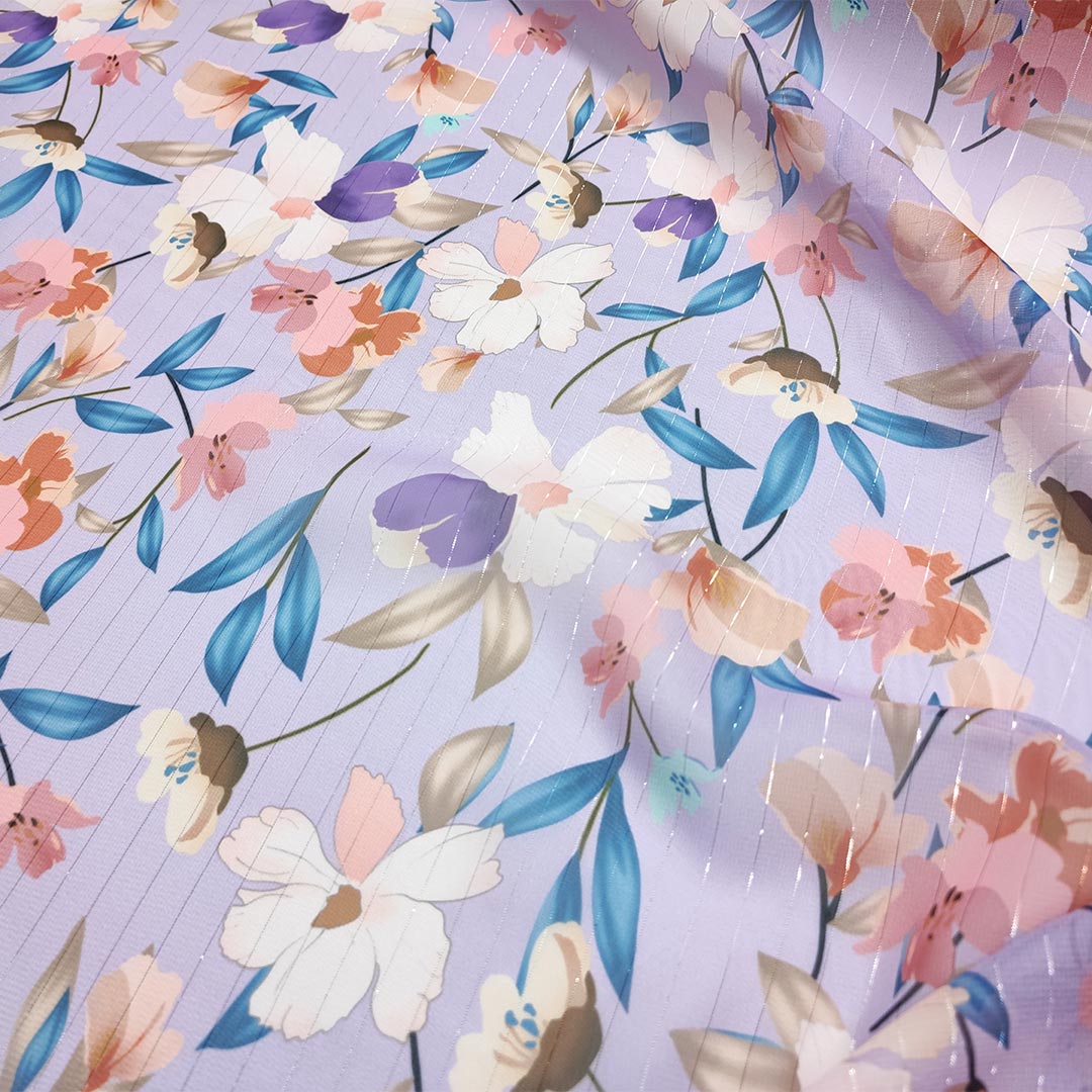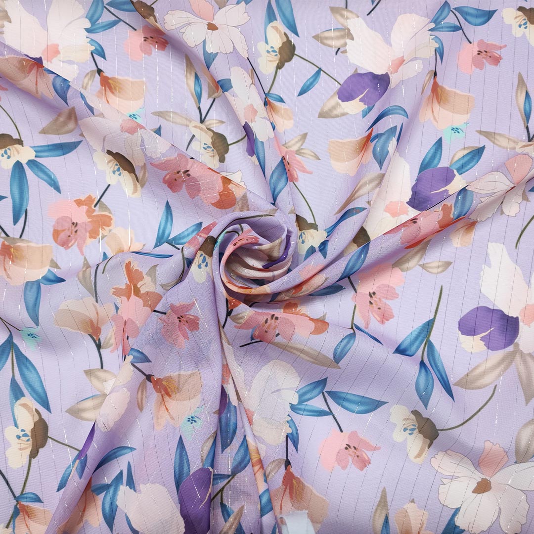 Tessuto Georgette lurex a fantasia motivo floreale lilla – rosa – blu navy
