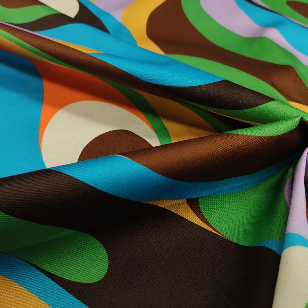 Tessuto Cotone a fantasia motivo astratto verde – marrone – lilla – turchese