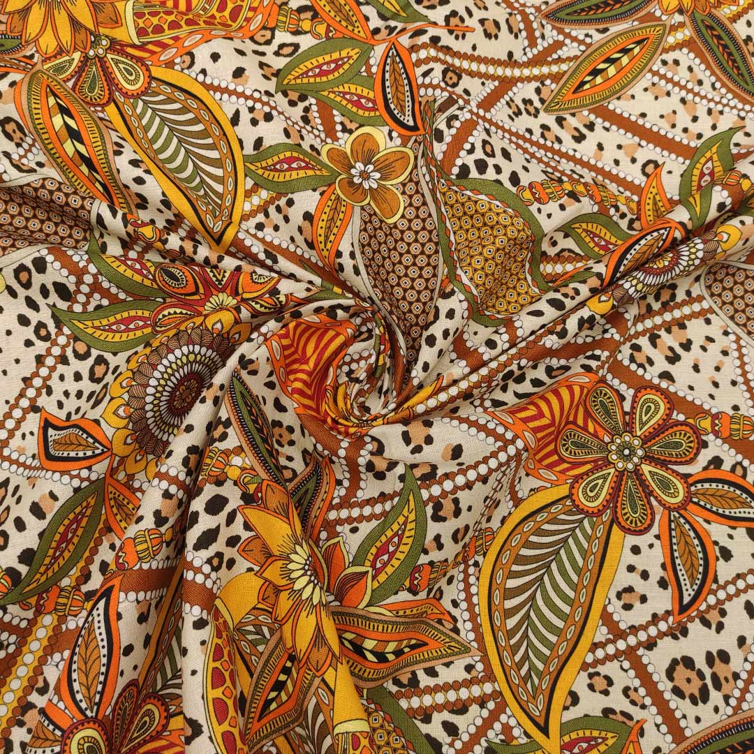 Tessuto Cotone e Lino a fantasia motivo etnico arancione – verde – ocra
