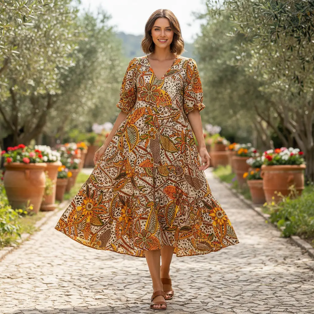 Tessuto Cotone e Lino a fantasia dalla mano morbida, leggera e fresca, ideale per realizzare capi comodi e freschi come: abiti, gonne, pantaloni e camicie.